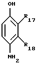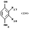 Из числа п-аминофенолов, пригодных в качестве окисляемых оснований в красящих композициях по изобретению, могут быть, в частности, названы соединения, соответствующие приведенной ниже формуле IV и их солевые аддукты с кислотами:![]() в которой R17 обозначает атом водорода или галогена, С1-С4-алкил, моногидрокси-С1-С4-алкил, С1-С4-алкокси-С1-С4-алкил, амино-С1-С4-алкил или гидрокси-С1-С4-алкиламино-С1-С4-алкил; R18 обозначает атом водорода или галогена, С1-С4-алкил, моногидрокси-С1-С4-алкил, полигидрокси-С2-С4-алкил, амино-С1-С4-алкил, циано-С1-С4-алкил или С1-С4-алкокси-С1-С4-алкил, при условии, что по меньшей мере один из радикалов R17 и R18 является атомом водорода. Из числа п-аминофенолов приведенной выше формулы IV можно, в частности, назвать п-аминофенол, 4-амино-3-метилфенол, 4-амино-3-фторфенол, 4-амино-3-гидроксиметилфенол, 4-амино-2-метилфенол, 4-амино-2-гидроксиметил фенол, 4-амино-2-метоксиметилфенол, 4-амино-2-аминометил-фенол, 4-амино-2-( -гидроксиэтиламинометил)фенол, 4-амино-2-фторфенол и их солевые аддукты с кислотами.