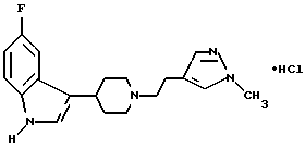 Соединение I3-[2-(диметиламино)этил] -N-метил-1Н-индол-5-метансульфонамида бутан-1,4-диоат (1:1) (Сукцинат суматриптана) ![]() Сукцинат суматриптана является коммерчески доступным под торговой маркой Imitrex TM или может быть получен в соответствии с описанием Патента США 5037845, выданного 6 августа 1991. Соединение II Гидрохлорид 5-фтор-3-{1-[2-[1-метил-1Н-пиразол-4-ил]этил] 4-пиперидинил} -1H-индола ![]() Соединение II может быть получено по следующей методике. 2-(1-метил-3-пиразоло)-1-этанол К смеси 200 г (2,85 моль) 2,3-дигидрофурана и 800 мл (4,81 моль) триэтилортоформиата по каплям добавляют 0,8 мл (6,5 ммоль) эфирата трифторида бора. После начального экзотермического эффекта реакционную смесь перемешивают при комнатной температуре в течение четырех дней. Затем к реакционной смеси добавляют 4,0 г карбоната натрия и реакционную смесь перегоняют при 6,0 мм рт.ст. Собирают фракции, кипящие между 60 и 130oС, получают 261,64 г (42,1%) светложелтого масла. Масс-спектр (м/е): 219 (М+). К раствору 87,2 г (0,40 моль) предварительно полученного желтого масла в 787 мл 1 н. НСl добавляют 21,3 мл (0,40 моль) метилгидразина и реакционную смесь кипятят с обратным холодильником при перемешивании в течение 4 часов. Затем реакционную смесь охлаждают до комнатной температуры и летучие вещества удаляют при пониженном давлении. Оставшееся масло обрабатывают 2 н. NaOH до получения основной среды и водный слой тщательно экстрагируют дихлорметаном. Объедиенные органические экстракты сушат над сульфатом натрия и концентрируют при пониженном давлении, получают 32,15 г (64,5%) названного соединения в виде коричневого масла. Масс-спектр (м/е): 126 (М+). Спектр ЯМР (ДМСО-d6, , м.д.): 7,45 (с, 1Н); 7,25 (с, 1Н); 4,65 (т, 1Н); 3,75 (с, 3Н); 3,55 (м, 2Н); 2,55 (т, 2Н).