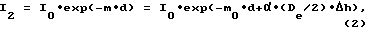 Изменение оптических свойств T локального участка упаковки задают следующими параметрами: T = F(C,Ea,t1,Ee),где С – химический состав стекла, Еа – энергия восстанавливающего действия окружающей среды, t1 – время хранения упаковки, Ее – средняя энергия ускоренных электронов. Пусть устойчивое интенсивное окрашивание стекла при его радиационной обработке гамма-излучением со средней энергией 1,2 МэВ (для радиационных установок с использованием Co60) наблюдается в стеклах толщиной 3 мм при поглощенной дозе 0,3 Мрад. При этом поглощенная доза практически равномерно распределена по толщине стекла, т.к. слой половинного ослабления стекла для гамма-квантов с энергией 1,2 МэВ составляет около 5 см. Пусть прозрачность стекла m линейно связана с поглощенной дозой D как m = m0+ ![]() D. (m0 – начальное значение коэффициента поглощения, – коэффициент пропорциональности, связывающий изменение коэффициента поглощения стекла с поглощенной дозой излучения). Тогда, согласно закону Бугера-Ламберта, справедливо соотношение, связывающее падающую световую мощность I0 и пропускаемую стенкой из стекла I1 толщиной d и прозрачностью m:I1 = I0 exp(-m d) = I0 exp(-m0 d+![]() D d). (1)Если поглощение излучения происходит в тонком слое стекла h, например, толщиной 0,1 мм, как в случае с электронным излучением с энергией электронов 160 кэВ, то для первоначально прозрачного стекла после облучения электронами с энергией 160 кэВ пропускаемая световая мощность может быть определена из соотношения:![]() где De/2 – усредненное значение поглощенной дозы по слою, т.к. на внешней поверхности слоя поглощенная доза – De, а на глубине h = 0.Совместное решение (1) и (2) для одинакового изменения оптических свойств упаковки из стекла толщиной d при облучении гамма-квантами с энергией 1,2 МэВ и электронами с энергией 160 кэВ дает соотношение для определения поглощенной дозы, которая должна быть при этом поглощена в поверхностном слое стекла: De = 2 D d/ h. (3)Подставляя исходные данные D= 0,3 Мрад, d=3 мм, h = 0,1 мм, получаем значение De=18 Мрад, т.е. значение, в 7,2 раз превышающее поглощенную дозу, необходимую для проведения стерилизации.