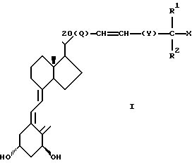 (57) Реферат: Изобретение относится к аналогам витамина D общей формулы I, где Х – гидрокси; R1 и R2 – одинаковые или разные, Н, СН3, С2Н5 или их циклопропил; Q – метилен, этилен, три- или тетраметилен, необязательно замещенный гидроксигруппой или группой -ОR3, где R3-Н, метил или этил; Y – одинарная связь или С1-С2– гидроксикарбилен. Описан способ получения I. Соединения обладают способностью индуцировать аномальную дифференциацию и/или пролиферацию клеток. 3 с. и 6 з.п. ф-лы, 3 табл.