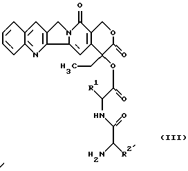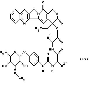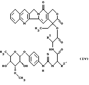 ![]() в которой R1 является полностью стереометрической неполярной боковой цепью аминокислоты, представленной алкильным радикалом, который имеет до 4 атомов углерода; R2 является основной боковой цепью аминокислоты, являющейся радикалом формулы -(СН2)n-R3, причем R3 является -NН2, ![]() n равно 1-4, а также их соли, стереоизомеры и смеси стереоизомеров. 2. Соединения формулы (I) по п. 1, причем R1 является разветвленным алкильным радикалом формулы ![]() ![]() R2 является радикалом формулы -(CH2)2-NH2, -(CH2)3-NH2, -(CH2)4-NH2, ![]() и их соли, стереоизомеры и смеси стереоизомеров. 3. Соединение по п. 1, которое является 20(S)-20-O-{ N -[O-(3-O-метил- L-фукопиранозил)-4-гидрокси-фениламино-тиокарбонил] -L-лизил-L-валил} -камптотецином формулы![]() и его солями. 4. Соединение по п. 1, которое является 20(S)-20-O-{ N -[O-(3-O-метил- -L-фукопиранозил)-4-гидрокси-фениламино-тиокарбонил] -L-гистидил-L-валил} -камптотецином формулы![]() и его солями. 5. Способ получения гликоконъюгатов формулы (I) ![]() в которой R1 является полностью стереометрической неполярной боковой цепью аминокислоты, представленной алкильным радикалом, который имеет до 4 атомов углерода; R2′ является основной боковой цепью аминокислоты, представленной радикалом формулы -(CH2)n-R3, причем R3 является -NH2, ![]() n равно 1-4, или их солей, отличающийся тем, что изотиоцианат формулы (II) ![]() взаимодействует с имеющим в боковой цепи защитную группу пептидилкамптотецином формулы (III) ![]() в которой R1 имеет вышеуказанное значение; R2 имеет значение вышеуказанного основного радикала R2, который кроме этого может находиться в основной группе обычной в химии пептидов защитной группы, до получения гликоконъюгата формулы (IV) ![]() в которой R1 и R2′ имеют вышеуказанные значения, при необходимости находящуюся в боковых цепях аминозащитную группу отщепляют по обычным методикам и полученное соединение превращают в предпочтительную соль. 6. Способ получения соединений общей формулы (I) или их солей, отличающийся тем, что изотиоцианат формулы (II) ![]() взаимодействует с конечной основной аминокислотой формулы (V), которая может иметь подходящую защитную группу ![]() в которой R2′ является основной боковой цепью аминокислоты, основные группы которой могут быть защищены, до получения конъюгата аминокислоты формулы (VI) ![]() в которой R2′ имеет вышеуказанное значение, и затем этот конъюгат превращают с конъюгатами аминокислоты формулы (VII) ![]() в которой R1 имеет вышеуказанное в п. 1 значение, при необходимости группу боковых цепей отщепляют и при необходимости соединение превращают в подходящую соль. 7. Лекарственное средство, обладающее способностью ингибировать рост объема опухолей или замедлять их рост, содержащее в качестве активного ингредиента соединения формулы (I) по п. 1. Приоритет по пунктам: 14.05.1997 – по пп. 1-5 и 7; 14.01.1998 – по п. 6. РИСУНКИ