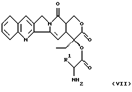 Таким образом, далее изобретение относится к альтернативному способу получения соединений общей формулы (I) или их солей, отличающемуся тем, что изотиоцианат формулы (II)![]() взаимодействует с подходящей защищенной конечной основной аминокислотой формулы (V) ![]() в которой R2 является основной боковой цепью аминокислоты, основные группы которой могут быть защищены, до получения конъюгата аминокислоты формулы (VI) ![]() в которой R2 имеет вышеуказанное значение, и затем этот конъюгат превращают с конъюгатами аминокислоты формулы (VII) ![]() в которой R1 имеет вышеуказанное значение, защитную группу боковых цепей отщепляют и соединение превращают в подходящую соль. В частности, после присоединения первой аминокислоты к камптотецину можно получить смеси диастереомеров. Чистые диастереомеры соединений данного изобретения получают, например, по вышеуказанному способу, по которому после присоединения первого элемента аминокислоты к камптотецину и последующего отщепления защитной группы диастереомеры разделяют подходящим способом. Из промежуточной смеси чистых диастереомеров по вышеуказанному способу можно получить целевую смесь чистых диастереомеров. Также возможно разделение смеси диастереомеров целевого соединения обычным способом на отдельные диастереомеры. Проведение реакций возможно при разных отношениях давления и температуры, например, давление 0,5-2 бар, соответственно температура от -30oС до +100oС, в подходящих растворителях, например, диметилформамиде, тетрагидрофуране, дихлорметане, хлороформе, низших спиртах, ацетонитриле, диоксане, воде или в смесях названных растворителей. Как правило, реакции предпочтительно проводят в диметилформамиде, дихлорметане или тетрагидрофуране/дихлорметане при комнатной температуре и нормальном давлении. Для активирования карбоксильных групп используют известные в химии пептидов соединяющие реагенты, как, например, в Jakubke/Jeschkeit: аминокислоты, пептиды, протеины; описаны в Verlag Chemie 1982 или Tetrahedr. Lett. 34, 6705 (1993). Предпочтительными являются, например, ангидриды N-карбоновой кислоты, хлорангидриды или смешанные ангидриды. В дальнейшем подходящим для активирования карбоксильных групп является образование аддуктов карбодиимидов, например, N,N’-диэтилкарбодиимид, N, N’-диизопропилкарбодиимид, N, N’-дициклогексилкарбодиимид, N-(3-диметиламинопропил)-N’-этил-карбодиимид-гидрохлорид, N-циклогексил-N’-(2-морфолиноэтил)-карбодиимид-мето-п-толуолсульфонат, или такие соединения карбонила, как, например, карбонилдиимидазол, или 1,2-оксазольные соединения, например, 2-этил-5-фенил-1,2-оксазол-3-сульфат или 2-трет-бутил-5-метил-изоксазолил-перхлорат, или ациламиновые соединения, например, 2-этокси-1-этоксикарбонил-1,2-дигидрохинолин, или ангидрид пропанфосфоновой кислоты, или изобутиловый эфир хлормуравьиной кислоты, или бензотриазолилокси-трис-(диметиламино)-фосфоний-гексафторофосфат, 1-гидроксибензотриазоловый эфир или N-гидроксисукцинимидовый эфир. В дальнейшем, возможно использование компонентов аминокислот в виде чистых ангидридов. В качестве оснований возможно использование, например, триэтиламина, этилдиизопропиламина, пиридина, N,N-диметиламинопиридина или других. В качестве защитных групп для третичного функционирования аминокислот возможно использование известных в химии пептидов защитных гру