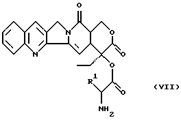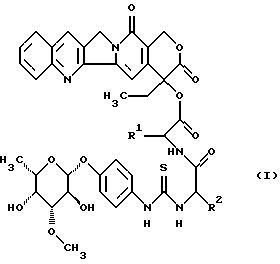 ![]() 20 лет спустя было найдено, что биологическая активность в ферментных ингибиторах топоизомераз I является обратимой. После этого исследовательские изыскания возобновились, чтобы получить совместимые и in vivo активные производные камптотецина. Соли производных камптотецина, модифицированные кольцами А и В, а также производные 20-O-ацила с ионизированными группами, которые используют для улучшения растворимости в воде, описаны (Vishnuvajjala et al. патент США US 4943579). Последние пролекарственные концепции позднее были перенесены на модифицированные производные камптотецина (Wani et al. международная заявка, WO 9602546). Но описанные пролекарства 20-O-ацила in vivo имеют очень короткий период полураспада и очень быстро расщепляются до основы. В международной заявке WO 9631532 Al описана модифицированная сахаром цитостатика, при которой связывание различных цитотоксичных или цитостатичных активных соединений с, например, региоселективно модифицированными углеводными элементами посредством определенного мостика приводит к улучшению опухолевой селективности. Из описанных в международной заявке WO 9631532 Al комбинаций углевода, мостика и активного вещества было неожиданно обнаружено, что связывание модифицированных элементов -L-фукозы в положении 3 с гидроксильной группой в положении 20 20(S)-камптотецина посредством модифицированного тиомочевиной пептидного мостика, состоящего из полностью стереометрической неполярной и основной аминокислоты, приводит к получению наиболее предпочтительных конъюгатов со следующими свойствами:– эфирное связывание носителя радикала с гидроксильной группой в положении 20 стабилизирует действие важного лактонового кольца в частях камптотецина; – специальная конформация дипептидного мостика показывает, что конъюгаты в экстраклеточной среде и в крови в сравнении с подобными, описанными в международной заявке WO 9631532 конъюгатами с другими мостиками, обладают четко улучшенной стабильностью. Конъюгаты данного изобретения являются более стабильными, чем описанные в патенте США US 4943579 пролекарства 20-O-ацила камптотецина; – конъюгаты данного изобретения лучше растворяются в воде, чем подобные конъюгаты из международной заявки WO 963I532; – конъюгаты данного изобретения in vivo показывают высокую активность в отношении опухолевых клеток и опухолевого ксенотрансплантата; – конъюгаты данного изобретения in vivo при внутривенном введении демонстрируют эксклеточную терапевтическую эффективность при больших дозах в отношении различных опухолей; – конъюгаты данного изобретения в отношении основного токсофора демонстрируют высокую совместимость и опухолевую селективность, особенно при токсичности костного мозга. Изобретение относится к соединениям общей формулы (I) ![]() в которой R1 является полностью стереометрической неполярной боковой цепью аминокислоты и R2 является основной боковой цепью аминокислоты, а также к их солям, стереоизомерам и смесям стереоизомеров. Предпочтительными являются соединения общей формулы (I), в которой R1 является разветвленным алкильным радикалом, который имеет до 4 атомов углерода и R2 является радикалом формулы -(CH2)n-R3, причем R3 является -NH2, ![]() n равно 1-4. Наиболее предпочтительными являются соединения общей формулы (I), в которой R1 является разветвленным алкильным радикалом формулы ![]() ![]() R2 явл