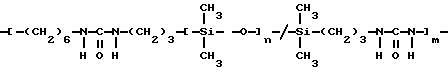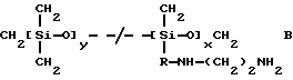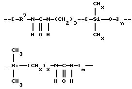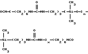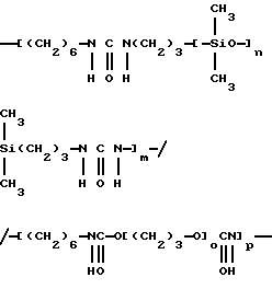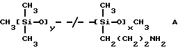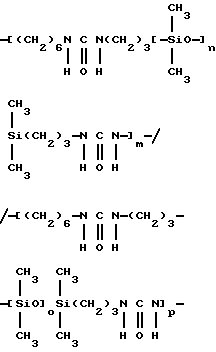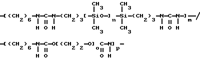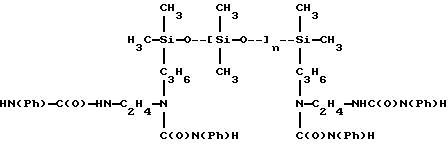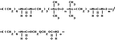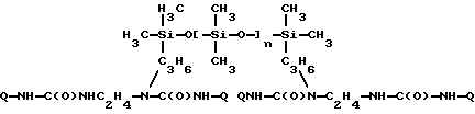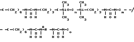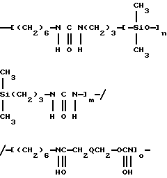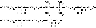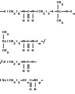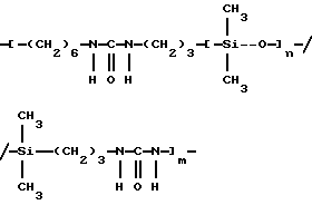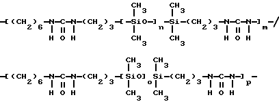 Полимер по настоящему изобретению, содержащий силоксановые звенья и группы, образующие водородные связи, может также представлять собой силоксановый полимер, образованный путем осуществления взаимодействия силоксановых полимеров с гребнеобразным разветвлением, имеющих боковые аминогруппы (например, аминогруппы на боковой цепи), с кислотой, изоцианатом и/или изотиоцианатом для образования полимеров с амидными, карбамидными и/или тиокарбамидными группами. Таким образом, эти силоксановые полимеры с гребнеобразным разветвлением подвергают взаимодействию с монофункциональными соединениями, например моноизоцианатами, с получением полимеров, содержащих силоксановые звенья и группы, образующие водородные связи, и действующих как загустители в композициях по настоящему изобретению. Гребнеобразно разветвленные силоксановые полимеры могут иметь одну аминогруппу на ответвление (например, аминопропильные ответвления) или же могут иметь диаминовые ответвления (например, аминоэтиламинопропильные или аминоэтиламиноизобутильные ответвления) или могут содержать смесь аминовых и диаминовых ответвлений. Иллюстративный силоксановый полимер с диаминовыми ответвлениями представляет собой аминофункциональный силиконовый полимер, такой как жидкость Доу Корнинг Q2-8220 (триметилсилиламодиметикон), которая является силиконовым полимером, в общем соответствующая формулеCH3Si(CH3)2O[Si(CH3)2O]x[Si(CH3)(СН2СН(СН3)СН2NНСН2СН2NН2] уSi(CH3)2CH3 где х и у являются собственностью ф. Доу Корнинг. Как у всех силоксановых полимеров, которые могут быть введены в композиции по настоящему изобретению, длину основной цепи (то есть число силоксановых звеньев) можно изменять для оптимизации свойств гелеобразователя и, кроме того, при использовании гребнеобразно разветвленных силоксановых полимеров можно для оптимизации свойств гелеобразователя изменять густоту ответвлений. Следующие ниже структуры (А) и (В) представляют иллюстративные гребнеобразно разветвленные силоксаны, соответственно имеющие аминовые и диаминовые ответвления: ![]() y=57; x=3 ![]() y=56: x=4 где знак “/” указывает, что сегменты могут иметь разную длину и могут быть расположены в случайном порядке, и где R представляет неразветвленную алифатическую группу, предпочтительно имеющую 1-6 углеродных атомов, а более предпочтительно 1-3 углеродных атома. Полимер, содержащий силоксановые звенья и группы, способные к образованию водородных связей, может, например, быть получен взаимодействием силооксанового полимера, содержащего по крайней мере три аминогруппы на молекулу полимера, с соединением, имеющим одну монофункциональную группу, причем соответственные монофункциональные группы (например, кислота, изоционат или изотиоцианат) взаимодействуют с одной из аминогрупп с образованием групп, способных к образованию водородных связей. Аминогруппы могут находиться на боковых цепях, отходящих от основной цепи силоксанового полимера, при этом группы, способные к образованию водородных связей, образуются на этих боковых цепях, или аминогруппы могут находиться на концах основной цепи, при этом группы, способные к образованию водородных связей, являются концевыми группами полимера (например, когда на реагирующем полимере имеется четыре аминогруппы, по две на каждом конце, полимерный продукт, имеющий группы