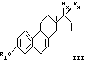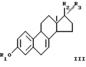 (57) Реферат: Изобретение относится к способу получения смеси сульфатированных эстрогенов, содержащей дельта – (8,9)-дегидроэстрон формулы I [дельта-(8,9)-ДГЭ] или его производные, где R1 – H, R2 – Н и R3 – O-ацил или R3 – Н и R2 – O-ацил, или R2 и R3 вместе – O и в формуле III R1– силил (алкил)3 или тетрагидропиранил, R2 и R3 вместе – O или R2 и R3 вместе – ацеталь. Способ включает (частичную) изомеризацию соединений формулы III обработкой литиевой солью этилендиамина или амидом лития в диметилсульфоксиде. Способ экономичен и прост в исполнении. 4 с. и 5 з.п. ф-лы. ![]()