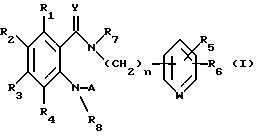 Данное изобретение относится к лекарственному средству, в частности к амидному производному, обладающему способностью ингибировать Са2+ каналы, активируемые высвобождением Са2+, и к фармацевтической композиции, содержащей его в качестве активного ингредиента, в частности ингибитора Са2+ каналов, активируемых высвобождением или выделением Са2+. Предпосылки создания изобретения Давно известно, что ионы кальция (Са2+) важны для внутриклеточного вторичного медиатора при активации различных клеток. Внутриклеточные Са2+ действуют также как важный регуляторный фактор в воспалительных клетках. Однако было высказано предположение, что блокаторы потенциалзависимых Са2+ каналов (далее называемых здесь ПЗКК), такие как нифедипин, не проявляют ингибирующей активности в отношении активации воспалительных клеток и что в воспалительных клетках имеется другой, а не через ПЗКК, механизм всасывания Са2+. Hoth et al. сообщают, что Са2+ селективные и активируемые истощением запасов Са2+ кальциевые каналы, а именно активируемые выделением Са2+ каналы (здесь далее называемые “АВККК”, также называемые зависимыми от накопления Са2+ каналами), присутствуют в тучных клетках и лимфоцитах, и эти клетки не чувствительны к мембранному потенциалу (Pflugers Arch., 430, pp. 315-322 (1955)). Известно, что АВККК есть у нескольких видов клеток, участвующих в воспалительном процессе, таких как тучные клетки, лимфоциты, астроциты (J. Biol. Chem., 270, pp. 29-32 (1995)) и тому подобные, и что это глубоко связано, например, с продукцией цитокинов и выделением липидного медиатора (J. Immunol. , 155, pp. 285-296 (1995) и Br. J. Pharmacol., 114, pp. 598-601 (1995)). Недавно было обнаружено, что противоартритное средство, тенидап, обладает активностью блокатора АВККК (Cell Calcium, 14, pp. 1-16 (1933)). Следовательно, существует возможность терапевтического действия блокатора АВККК при хронических воспалительных заболевания, включая ревматоидный артрит. Известно, что АВККК присутствуют также и у эндотелиальных клеток (Am. J. Physiol. , 269, с. 733-738 (1995)) и у эпителиальных клеток (J. Biol. Chem., pp. 29169-29175 (1995)). Так как сообщалось, что непрерывное всасывание кальция играет роль в радикальном воздействии на эндотелиальные клетки (Am. J. Physiol. , 261, с. 889-896 (1991), предполагается, что блокатор АВККК должен обладать защитным (профилактическим) действием в отношении связанного с эндотелиальными клетками поражения тканей. Кроме того, сообщалось, что блокада всасывания кальция подавляет пролиферацию клеток и продукцию интерлейкина 2 (ИЛ-2) (Br. J. Pharmacol., 113, pp. 861-868 (1994)). Следовательно, ингибитор АВККК может использоваться в качестве средства для профилактики и лечения пролиферативных или прогрессирующих заболеваний (например, злокачественных опухолей и тому подобного) и аутоиммунных заболеваний, а также в качестве супрессора отторжения при трансплантации. С другой стороны, известно, что в чувствительных к раздражению клетках, таких как клетки гладких мышц и нервные клетки, внутриклеточное содержание кальция в основном регулируется с помощью ПЗКК, а не с помощью АВККК. Поэтому ожидается, что блокатор кальциевых каналов, обладающий селективностью в отношении АВККК по сравнению с ПЗКК, может использоваться в качестве средства для профилактики или лечения различных воспалительных заболеваний, аллергических заболеваний, аутоиммунных заболеваний, повреждения тканей, пролиферативных забо