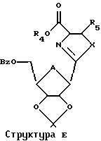 Пример 8Этиловый эфир 2-(5′-O-бензоил-2′,3′-O-изопропилиден- -D-рибофуранозил)тиазолин-4-карбоновой кислоты (9)К перемешиваемому раствору 5′- -бензоил-2′,3′- -изопропилиден- -D-рибофуранозил-1-карбонитрила ( , 4,71 г, 15,55 ммоль) в сухом метиленхлориде (150 мл) при комнатной температуре в атмосфере аргона добавляли гидрохлорид этилового эфира цистеина (1,49 г, 8 ммоль) и (0,81 г, 8 ммоль) в час 0, через 2 часа, через 4 часа и через 6 часов. Реакционную смесь перемешивали при комнатной температуре в атмосфере аргона в течение 24 часов. Реакционную смесь разбавляли метиленхлоридом (100 мл), промывали водой (200 мл) и рассолом (150 мл). СН2Сl2 экстракт сушили над безводным MgSO4, фильтровали, промывали СН2Сl2 (50 мл) и фильтрат выпаривали до сухого состояния. Остаток использовали как есть для следующей реакции. Небольшое количество неочищенного продукта очищали флэш-хроматографией над силикагелем, используя смесь гексан/этилацетат в качестве элюента и характеризовали посредством протонной спектроскопии. 1Н ЯМР (CDCl3): 1,24 (t, 3Н), 1,35 (s, 3Н), 1,52 (s, 3Н), 3,40 (m, 2H), 4,20 (m, 2H), 4,42 (m, 3Н), 4,80 (m, 2H), 5,12 (m, 2H), 7,42 (m, 2H), 7,58 (m, 1H) и 8,08 (m, 2H).