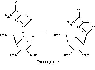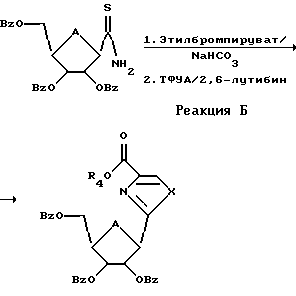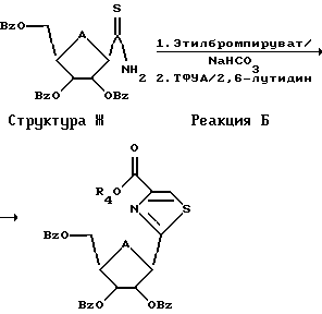 ![]() предоставляют соединение, соответствующее Структуре Б ![]() L структуры Б подвергают реакции с образованием Структуры Г, имеющей гетероциклическое кольцо, в одну стадию и ![]() ароматизируют это гетероциклическое кольцо в одну стадию, где А представляет собой О, где L представляет собой -CN; X представляет собой S; R1, R2 и R3 представляют собой Н; R4 представляет собой Н или низший алкил; В1, В2 и В3 независимо представляют собой блокирующие группы или низший алкил и Z1, Z2 и Z3 представляют собой Н и где стадия реакции L Структуры Б с образованием Структуры Г включает в себя взаимодействие Структуры Б со Структурой В, где XY представляет собой SH и 4 представляет собой низший алкил ![]() 2. Способ по п. 1, где соединение, соответствующее Структуре Б, представляет собой Структуру Д ![]() 3. Способ по п. 2, где стадия реакции L с образованием Структуры Г включает в себя взаимодействие Структуры Д со Структурой В, где Y представляет собой Н или низший алкил ![]() 4. Способ по п. 1, при котором далее соединение Структуры Е ароматизируют ![]() 5. Способ по п. 4, где стадия ароматизирования включает в себя обработку соединения Структуры Е активированным диоксидом марганца ![]() 6. Способ по п. 5, где указанное соединение содержит изопропилиденовую группу и эту изопропилиденовую группу удаляют путем обработки реагентом, выбранным из группы, состоящей из трифторуксусной кислоты, муравьиной кислоты, уксусной кислоты, Н+ смолы в органическом растворителе и иода в метаноле. 7. Способ по любому из пп. 1-6, где указанный нуклеозид далее подвергают реакции с образованием Тиазофурина. 8. Способ по любому из пп. 1-6, где соединение Структуры Б является бета изомером. 9. Способ синтеза нуклеозида, при котором сахар Структуры Ж подвергают взаимодействию с этилбромпируватом согласно реакции Б ![]() 10. Способ по п. 9, где указанный нуклеозид далее подвергают реакции с образованием Тиазофурина. 11. Способ по п. 9, где соединение Структуры Ж является бета изомером. РИСУНКИ