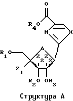 Разумеется, способы по изобретению, описанные здесь, не ограничены только производством Тиазофурина, и они без труда могут быть распространены, в том числе особенно вторая и третья группа способов, на практически все С-нуклеозиды. Вообще С-нуклеозид согласно настоящему изобретению подпадает под общую структуру А, где А представляет собой О, S, СН2 или NR, где R представляет собой Н или блокирующую группу; Х представляет собой О, S, Se или NH; R1, R2, R3 и R4 независимо представляют собой Н или низший алкил; и Z1, Z2 и Z3 независимо представляют собой Н или не Н.