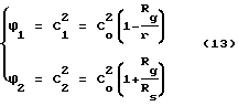 Действительно, если выделить в упругом вакууме некую сферическую границу и начать ее равномерно сжимать до радиуса Rs вместе со средой, то внутренняя область сжатия увеличит квантовую плотность среды за счет растяжения внешней области, уравновешивая систему. Этот процесс описывается уравнением Пуассона как дивергенция градиента квантовой плотности среды или гравитационного потенциала. Решения уравнений Пуассона (11) и (13) позволяют составить точный баланс квантовой плотности среды и гравитационных потенциалов для внешней области деформированного вакуума при 1 = и 1 = C21 = C2 o = + n (14)C2o = C2+ n (15)где n – изменение квантовой плотности среды под действием ньютоновского потенциала n; n – ньютоновский гравитационный потенциал (6), м2/с2; С2 – гравитационный потенциал возмущенного гравитацией вакуумного поля, м2/с2.