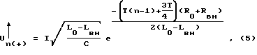 Точки кривой 1 вычислены по формуле![]() Точки кривой 2 вычислены по формуле ![]() Точки кривой 3 вычислены по формуле ![]() Графики показывают, что при увеличении диапазона вносимых сопротивлений точка экстремума, соответствующая наивысшей чувствительности, становится более выраженной и сдвигается влево, что соответствует полупериоду с меньшим порядковым номером. При уменьшении диапазона вносимых сопротивлений точка перегиба становится менее выраженной и сдвигается вправо, что соответствует полупериоду с большим порядковым номером. Компенсация погрешности, вызванной влиянием температуры окружающей среды на активное сопротивление катушки вихретокового преобразователя, осуществляется следующим образом. Под воздействием температуры окружающей среды происходит изменение активного сопротивления катушки контура R0, что в соответствии с формулами (5-8) приводит к изменению выходного напряжения. Активное сопротивление катушки с учетом температуры окружающей среды вычисляется по формуле R0=Rн(1+ (t-25)), (9)где Rн – активное сопротивление катушки при нормальной температуре 25oС; – температурный коэффициент металла намоточного провода (для меди = 0,004);t – температура окружающей среды oС; число 25 – температура, oС, в нормальных условиях. На фиг.4 показана зависимость амплитуды полупериода для контура (катушка намотана медным проводом), с параметрами С=300 пФ, L=20 мкГн, Rн=5 Ом, током (вытекающим) возбуждения 15 мА и постоянными Rвн=5 Ом, Lвн=0 от температуры окружающей среды. График построен по формуле (5) с подстановкой формулы (9) для n=5 и диапазона температуры t=-40…+85oС. Как видно из фиг. 4, зависимость амплитуды полупериода от температуры практически линейна, что делает возможным согласно формуле (5) скомпенсировать данную температурную погрешность корректировкой величины тока возбуждения I, который выступает в качестве переменного коэффициента. Для компенсации температурной погрешности, возникающей при увеличении температуры, необходимо пропорционально увеличивать ток возбуждения и, соответственно, уменьшать ток при уменьшении температуры. Компенсацию температурной погрешности осуществляют за счет прерывистой положительной обратной связи. Сначала вихретоковый преобразователь подключают к источнику тока, выходная величина которого имеет заранее известное нормированное значение. Затем измеряют падение напряжения на активном сопротивлении катушки, возникающее от протекания нормированного тока, которое пропорционально температуре окружающей среды и текущему значению активного сопротивления катушки. После этого пропорционально измеренному падению напряжения корректируют значение тока возбуждения. После отключения вихретокового преобразователя от источника тока (фаза возникновения затухающих колебаний) его выходную величину восстанавливают до исходного нормированного значения. Устройство для осуществления способа (см. фиг.1) содержит последовательно соединенные источник постоянного стабильного тока 1, первый коммутирующий элемент 3, вихретоковый преобразователь 5, второй коммутирующий элемент 6, обнуляемый пиковый детектор 8, элемент выборки-хранения 10, выход которого является выходом устройства, второй вход которого соединен со вторым выходом синхронизатора 4, третий выход которого соединен со вторым входом второго элем