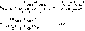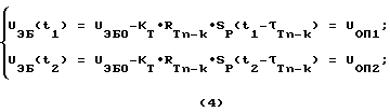 В моменты времени t1 и t2 – сравнения напряжения UЭБ(t) с опорными напряжениями UОП1 и UОП2 схема сравнения вырабатывает управляющие импульсы, первый из которых запускает счетчик, а второй – останавливает счет импульсов коллекторного напряжения; число m подсчитанных импульсов за время t2-t1 связано с искомой величиной RTn-k простым соотношением, которое легко получается из решения системы уравнений: