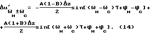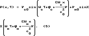 Физический механизм поглощения сигнальной волны в заявляемом способе и прототипе можно объяснить, используя метод возмущений. Воспользуемся уравнением (1), заменив в нем производную ![]() / x отношением достаточно малых, но конечных приращений, тогда величину![]() можно рассматривать как малую добавку к полю исходных волн, обусловленную их взаимодействием на малом расстоянии x. Вводя новые переменные![]() получим: ![]() При граничном условии (4), представленном с учетом введенных переменных в виде u(z = 0) = sin( н + н)+Asin( c + c),поправка первого порядка к полю исходных волн, описывающая результат взаимодействия исходных волн, содержит компоненты с частотами н![]() c,![]() Взаимодействие этих комбинационных компонент с накачкой (в рамках второго приближения) приводит к генерации волны с частотой, равной частоте сигнальной волны ![]() но находящейся к сигнальной волне в противофазе, см. знак минус в (15). При В 1 убыль амплитуды сигнальной волны в прототипе на малом расстоянии z согласно (15) имеет второй порядок малости относительно z (где z<<1). Подставив в (14) В=1/2 и н= 2 c убеждаемся, что в заявляемом способе убыль амплитуды сигнальной волны имеет первый порядок малости относительно z![]() т.е. подавление происходит более эффективно, чем в прототипе. Таким образом, в заявляемом способе подавление сигнала происходит уже на первом этапе взаимодействия с накачкой ( поправка первого порядка малости). В прототипе же подавление сигнальной волны носит “двухступенчатый” характер ( поправка второго порядка малости): вначале идет взаимодействие сигнала и накачки с образованием комбинационных волн, а лишь потом взаимодействие комбинационных волн с накачкой, приводящее к подавлению сигнала.