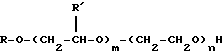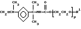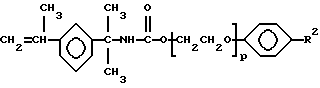Предпочтительны моногидратные неионные поверхностно-активные вещества, описываемые формулой:![]() в которой R является С6-30алкилом или С8-30аралкилом, R’ является С1-4алкилом, n является средним числом примерно от 5 до 150, a m – средним числом примерно от 0 до 50, при условии, что n имеет по крайней мере такую же величину, как и m, и что n+m=5-150. В качестве примера предпочтительных С6-30алкилов можно назвать додецильный и С18-26алкильный радикалы, а в качестве аралкильных групп можно назвать алкил (C8-13)фенил. Предпочтительным радикалом R’ является метил. Моноэтиленненасыщенный моноизоцианат, используемый для образования указанного неионного уретанового мономера b) может быть выбран из числа самых разнообразных соединений. Так, можно использовать соединение, содержащее любую сополимеризуемую ненасыщенную группу, например акриловую или метакриловую ненасыщенную группу. Можно также использовать ненасыщенную аллильную группу аллилового спирта. Предпочтительным моноэтиленовым моноизоцианатом является , –диметил-м-изопропенилбензилизоцианат.