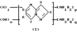 Таким образом, первым предметом изобретения является композиция для окислительной окраски кератиновых волокон и, в частности, кератиновых волокон человека, таких, как волосы, отличающаяся тем, что она включает в подходящей для окраски среде:– по крайней мере одно первое окисляющееся основание, выбираемое среди пиразол[1,5-а]пиримидинов следующей формулы (I): ![]() в которой R1, R2, R3 и R4, одинаковые или разные, означают атом водорода, (C1-C4)-алкил, арил, гидрокси-(C1-C4)-алкил, полигидрокси-(С2-С4)-алкил, (C1-C4)-алкокси-(C1-C4)-алкил, амино-(C1-C4)-алкил (причем аминогруппа может быть защищена ацетилом, уреидо, сульфонилом), (C1-C4)-алкиламино-(C1-C4)-алкил, ди[(C1-C4)-алкил)] амино-(С1-С4)-алкил (причем диалкилы могут образовывать пяти- или шестичленный алифатический цикл или гетероцикл), гидрокси-(С1-С4)-алкил- или ди[гидрокси-(C1-С4)-алкил] амино-(C1-C4)-алкил; радикалы X, одинаковые или разные, означают атом водорода, (C1-C4)-алкил, арил, гидрокси-(C1-C4))-алкил, полигидрокси-(C2-C4)-алкил, амино-(С1-С4)-алкил, (C1-C4)-алкиламино-(C1-C4)-алкил, ди[(C1-C4)-алкил)] амино-(C1-C4)-алкил (причем диалкилы могут образовывать пяти- или шестичленный алифатический цикл или гетероцикл), гидрокси-(C1-С4)-алкил- или ди[гидрокси-(C1-C4)-алкил] амино-(C1-C4)-алкил, аминогруппу, (C1-C4)-алкил- или ди[(С1-С4)-алкил]-аминогруппу, атом галогена, карбоксильную группу, сульфогруппу; i означает 0, 1, 2 или 3; р означает 0 или 1; q означает 0 или 1; n означает 0 или 1, при условии, что (i) сумма (p+q) отлична от нуля; (ii) когда сумма (p+q) равна 2, тогда n означает нуль и группы NR1R2 и NR3R4 занимают положения (2, 3); (5, 6); (6, 7); (3, 5) или (3, 7); (iii) когда сумма (p+q) равна 1, тогда n означает 1 и группа NR1R2 (или NR3R4) и группа ОН занимают положения (2, 3); (5, 6); (6, 7); (3, 5) или (3, 7); их солей присоединения с кислотой или основанием; – по крайней мере одно второе окисляющееся основание, выбираемое среди N,N-бис( -гидроксиэтил)-п-фенилендиамина и его солей присоединения с кислотой; и– по крайней мере один краскообразующий компонент, выбираемый среди м-фенилендиаминов и м-аминофенолов, следующей формулы (II): ![]() в которой R5 и R8, одинаковые или разные, означают атом водорода; атом галогена, такой, как атом хлора, брома, иода или фтора; (C1-C4)-алкил, моногидрокси-(C1-C4)-алкил, полигидрокси-(С2-С4)-алкил, (C1-C4)-алкоксил, моногидрокси-(C1-C4)-алкоксил или полигидрокси-(С2-С4) -алкоксил; R6 означает атом водорода, (C1-C4)-алкил, моногидрокси-(C1-C4)-алкил или полигидрокси-(C1-C4)-алкил, амино-(C1-C4)-алкил; R7 означает атом водорода, (С2-С4)-алкил, (C1-C4)-алкоксил или атом галогена, выбираемый среди атомов хлора, брома или фтора; при условии, что, когда R5 означает атом хлора и R6 и R7 одновременно означают атом водорода, тогда R8 отличается от метила, и их солей присоединения с кислотой. Красящая композиция согласно изобретению приводит к интенсивным хроматическим окрашиваниям, обладающим незначительной избирательностью и превосходной устойчивостью одновременно по отношению к атмосферным факторам, таким, как свет и непогода, и по отношению к потению и различным обработкам, которым могут подвергаться волосы. Предметом изобретения также является способ окислительной окраски кератиновых волокон, при котором используют эту красящую композицию. Пиразол[1,5-а] пиримидины формулы (I), используемые в качестве первого окисляющегося основания в красящей композиции согласно изобретению, представляют собой известные соединения, описанные в заявке на патент Фр