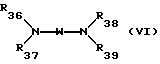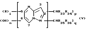 ![]() в которой R33, R34, R35 и R36, одинаковые или разные, обозначают атом водорода, С1-С4-алкил, арил, гидрокси-С1-С4-алкил, полигидрокси-С2-С4-алкил, С1-C4-алкокси-С1-С4-алкил, амино-С1-С4-алкил (аминогруппа может быть защищена ацетильной, уреидо- или сульфонильной группой), C1-C4-алкиламино-С1-С4-алкил, ди(С1-С4-алкил)амино-С1-С4-алкил (диалкилы могут образовывать 5- или 6-членный алифатический цикл или гетероцикл), гидрокси-С1-С4-алкил- или ди(гидрокси-С1-С4-алкил)амино- С1-С4-алкил; радикалы R, одинаковые или разные, обозначают атом водорода, С1-С4-алкил, арил, гидрокси-С1-С4-алкил, полигидрокси-С2-С4-алкил, амино-С1-С4-алкил, С1-С4-алкиламино-С1-С4-алкил, ди(С1-С4-алкил)амино-С1-С4-алкил (диалкилы могут образовывать 5- или 6-членный алифатический цикл или гетероцикл), гидрокси-С1-С4-алкил- или ди(гидрокси-С1-С4-алкил)амино-С1-С4-алкил, аминогруппу, С1-С4-алкил- или ди(С1-С4-алкил)аминогруппу, галоген, остаток карбоновой кислоты или сульфокислоты; i равно 0, 1, 2 или 3; р равно 0 или 1; q равно 0 или 1; n равно 0 или 1; при условии что (i) сумма p+q отлична от 0; (ii) когда p+q= 2, то n= 0, а группы NR33R34 и NR35R36 занимают положения (2, 3), (5, 6), (6, 7), (3, 5) или (3, 7); (ii) когда p+q= l, то n= 1, а группа NR33R34 (или NR35R36) и группа ОН занимают положения (2, 3), (5, 6), (6, 7), (3, 5) или (3, 7). 3. Композиция по п. 2, отличающаяся тем, что пиразоло[1,5-а] -пиримидины формулы V могут быть выбраны из следующих соединений: пиразоло-[1,5-а] -пиримидин-3,7-диамин; 2-метил-пиразоло-[1,5-а] -пиримидин-3,7-диамин; -2,5-диметил-пиразоло-[1,5-а] -пиримидин-3,7-диамин; – пиразоло-[1,5-а] -пиримидин-3,5-диамин; -2,7-диметилпиразоло-[1,5-а] -пиримидин-3,5-диамин; -3-аминопиразоло-[1,5-а] -пиримидин-7-ол; -3-амино-5-метилпиразоло-[1,5-а] -пиримидин-7-ол; -3-аминопиразоло-[1,5-а] -пиримидин-5-ол; -2-(3-аминопиразоло-[1,5-а] -пиримидин-7-иламино)этанол; -3-амино-7- -гидроксиэтиламино-5-метил-пиразоло-[1,5-а] -пиримидин;-2-(7-аминопиразоло-[1,5-а] -пиримидин-3-иламино)этанол; -2[(3-аминопиразоло-[1,5-а] -пиримидин-7-ил)-(2-гидроксиэтил) амино] этанол; -2[(7-аминопиразоло-[1,5-а] -пиримидин-3-ил)-(2-гидроксиэтил) амино] этанол; -5,6-диметилпиразоло-[1,5-а] -пиримидин-3,7-диамин; -2,6-диметилпиразоло-[1,5-а] -пиримидин-3,7-диамин; -2,5, N-7, N-7-тетраметилпиразоло-[1,5-а] -пиримидин-3,7-диамин, и их солевые аддукты с кислотами или основаниями. 4. Композиция по п. 1, отличающаяся тем, что прямой катионный краситель или красители выбирают из числа катионных аминоантрахиноновых соединений, катионных моно- и диазосоединений и катионных нафтохинонов. 5. Композиция по п. 4, отличающаяся тем, что прямые катионные красители выбирают из следующих соединений: хлорид [8-[(п-аминофенил)азол] -7-гидрокси-2-нафтил] триметиламмония, комбинация хлорида 3[(4-амино-6-бром-5,8-дигидро-1-гидрокси-8-имино-5-оксо-2-нафталенил)амино] -N, N, N-триметилбензаминия и хлорида 3-[(2,6-дибром-5,8-дигидро-1-гидрокси-8-имино-5-оксо-3-нафтил)амино] -N, N, N-триметилбензаминия, хлорид 7-гидрокси-8-[(2-метоксифенил)азо] -N, N, N-триметил-2-нафтаминия, хлорид [8-[(4-амино-2-нитрофенил)азо] -7-гидрокси-2-нафтил] триметиламмония, комбинация хлорида [(8-[(4-амино-3-нитрофенил)азо] -7-гидрокси-2-нафтил] триметиламмония и хлорида [8-[(4-амино-2-нитрофенил)азо] -7-гидрокси-2-нафтил] триметиламмония, хлорид 3-[(4,5-дигидро-3-метил-5-оксо-1-фенил-1Н-пиразол-4-ил)азо] -N, N, N-триметилбензаминия, гидрохлорид 1-( -аминопропил)аминоантрахинона, метилсульфат 1-N-(метилморфолинийпропил)амино-4-гидроксиантрахинон и Basic Orange 69 .6. Композиция по п. 1, отличающаяся тем, что прямой катионный краситель или 