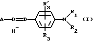 ПРИМЕР ОКРАШИВАНИЯ В ЩЕЛОЧНОЙ СРЕДЕПриготовили следующую композицию по изобретению: – пиразол-[1,5-а] -пиримидин-3,7-диамин, 2НСl (окисляемое основание) – 0,333 г; – прямой катионный краситель формулы 12 – 1 г; – этиловый спирт 96%-ный – 18 г; – пентанатриевая соль диэтилентриаминопентауксусной кислоты – 1,1 г; – 20%-ный аммиак – 10,0 г; – деминерализованная вода в достаточном количестве – до 100 г. В момент применения смешивают приведенную выше красящую композицию с равным по массе количеством 20%-ного по объему (6% по массе) раствора перекиси водорода с рН 3. Полученную смесь наносят на пряди натуральных седых волос с 90% седины на 30 мин. Пряди после этого ополаскивают, моют стандартным шампунем, вновь ополаскивают и сушат. Волосы окрашиваются в сильный оттенок фуксия. Формула изобретения