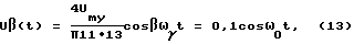 Напряжение U9(t) подают на вход выпрямителя 10, на выходе которого имеют напряжение0 U9(t)![]() (24)После разложения (24) в ряд Фурье имеют ![]() Напряжение U9(t) подают на ПФ 11, который настроен на частоту 0 = ![]() ![]() ![]() , при = 10 напряжение на выходе ПФ 11 равно![]() Усиливают усилителем 12 амплитуду напряжения (26) в 120 раз, при этом получают напряжение в пункте передачи фиг.2, которое равно U0(t) = Umocos( ot+ o) = 12cos( ot+ o), (27)где Um0(t)=12 В – амплитуда, o– начальная фаза.