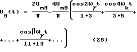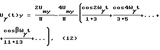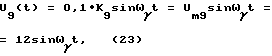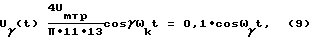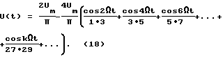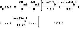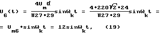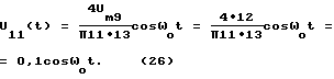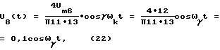 Напряжение (19) подают на выпрямитель 7, с выхода которого имеют напряжение![]() после разложения (20) в ряд Фурье имеют ![]() Напряжение (21) подают на ПФ 8. Напряжение на выходе ПФ 8, который настроен на частоту ![]() = ![]() ![]() k при = 10, равно![]() где Um8= 0,1 В – амплитуда напряжения U8(t). Считаем коэффициенты передачи ПФ равными единице. Напряжение U8(t) подают на вход усилителя 9, где усиливают амплитуду в 120 раз напряжение, на выходе которого равно ![]() где к9=120 – коэффициент усиления усилителя 9. Um9=0,1 120=12 В – амплитуда.