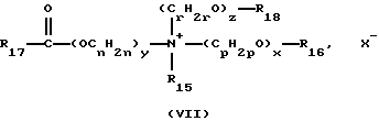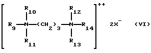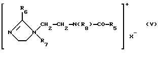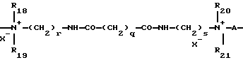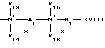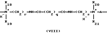 (1) гомополимеров или сополимеров, происходящих от эфиров или амидов акриловой или метакриловой кислоты и включающих по крайней мере одно из звеньев следующих формул ![]() ![]() ![]() ![]() в которых R3, одинаковые или разные, означают атом водорода или радикал СН3; А, одинаковые или разные, означают линейную или разветвленную алкильную группу с 1-6 атомами углерода или гидроксиалкильную группу с 1-4 атомами углерода; R4, R5, R6, одинаковые или разные, означают алкильную группу с 1-18 атомами углерода или бензильный радикал; R1 и R2, одинаковые или разные, означают атом водорода или алкильную группу с 1-6 атомами углерода; Х означает анион, происходящий от неорганической или органической кислоты; (2) производных простых эфиров целлюлозы с четвертичными аммониевыми группами; (3) катионных производных целлюлозы, таких как привитые сополимеры целлюлозы или производные целлюлозы, к которым привит водорастворимый четвертичный аммониевый мономер; (4) катионных полисахаридов; (5) полимеров, образованных пиперазинильными звеньями и алкиленовыми или гидроксиалкиленовыми двухвалентными радикалами с линейными или разветвленными цепями, возможно прерываемыми атомами кислорода, серы, азота или ароматическими циклами или гетероциклами, а также продуктов окисления и/или кватернизации этих полимеров; (6) водорастворимых полиаминоамидов, получаемых, в частности, путем реакции поликонденсации соединения кислотного характера с полиамином; причем эти полиаминоамиды могут быть сшиты с помощью эпигалогенгидрина, диэпоксида, диангидрида, ненасыщенного диангидрида, бисненасыщенного производного, бисгалогенгидрина, бисазетидиния, бисгалоген-ацилдиамина, алкилдигалогенида или с помощью олигомера, получающегося в результате реакции дифункционального соединения, реакционноспособного по отношению к бисгалогенгидрину, бисазетидинию, бисгалогенацилдиамину, алкилдигалогениду, эпигалогенгидрину, диэпоксиду или бисненасыщенному производному, причем сшивающий агент используют в количествах 0,025-0,35 моль на аминогруппу полиаминоамида; и причем эти полиаминоамиды могут быть алкилированы или они содержат одну или несколько кватернизованных третичных аминогрупп; (7) производных полиаминоамидов, получающихся в результате реакции конденсации полиалкиленполиаминов с поликарбоновыми кислотами с последующим алкилированием с помощью бифункциональных агентов; (8) полимеров, получаемых путем взаимодействия полиалкиленполиамина, содержащего две первичные аминогруппы и по крайней мере одну вторичную аминогруппу, с дикарбоновой кислотой, выбираемой среди дигликолевой кислоты и насыщенных алифатических дикарбоновых кислоты с 3-8 атомами углерода; (9) циклополимеров алкилдиаллиламина или диалкилдиаллиламмония; (10) четвертичного диаммониевого полимера, включающего повторяющиеся звенья, которые отвечают формуле (VII) ![]() в которой R13, R14, R15 и R16, одинаковые или разные, означают алифатические, алициклические или арилалифатические радикалы с 1-20 атомами углерода или низшие гидрокси-алкилалифатические радикалы; или R13, R14, R15 и R16, вместе или отдельно, вместе с атомами азота, с которыми они связаны, образуют гетероциклы, возможно содержащие второй гетероатом, отличный от азота; или R13, R14, R15 и R16 означают линейный или разветвленный алкильный радикал с 1-6 атомами углерода, замещен