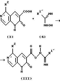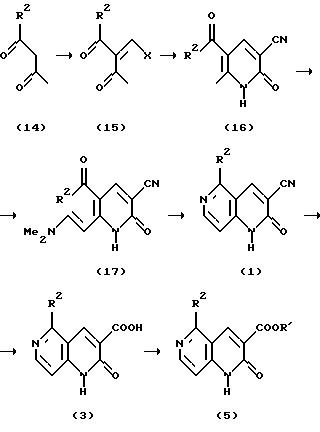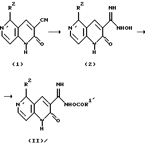 Большинство из ранее известных соединений БДА, например соединений формул (А), (В) и (С), имеют агонистические свойства. С другой стороны, некоторые соединения имеют наоборот противоположные агонистические свойства, например соединения следующих формул (D) и (Е) (DMCM и FG7142):![]() ![]() DMCM и FG7142 раскрыты в: Colin R. Gardner, Drugs of the Future, vol. 14, pp. 51-67 (1987). Кроме этого, многие исследования проводились в отношении корреляции между способом связывания с рецептором бензодиазепина и фармакологическими активностями соединений. Как упоминалось выше, агонисты БДА применяют в качестве анксиолитического средства средства для лечения гипнотических расстройств (лекарственного средства, вызывающего сон) или противоэпилептического средства, но известно, что кроме этих активностей, они также вызывают потерю памяти у животных, включая людей. Соответственно ожидается, что обратные агонисты БДА будут иметь активность, обратную активности, вызывающей потерю памяти, т.е. противоамнезийную активность, психоаналептическую активность. Кроме того, известно, что активность ацетилхолина, который является важным в отношении функции познавательной способности, уменьшается через посредство агонистов БДА, и поэтому предполагается, что обратные агонисты БДА будут проявлять активность, увеличивающую познавательную способность. Таким образом, ожидается, что обратные агонисты БДА могут быть пригодны в качестве психоаналептического лекарственного средства и лекарственного средства для лечения дисмнезии при старческом слабоумии, цереброваскулярном слабоумии и болезни Альцгеймера. В литературе не имеется сообщений, касающихся соединений настоящего изобретения, которые имеют приведенную здесь выше формулу (I), обладают высокоселективным сродством к рецептору бензодиазепина и в особенности действуют как обратный агонист БДА. Описание изобретения Это изобретение предусматривает новое производное 5-замещенного-3-оксадиазолил-1,6-нафтиридин-2(1Н)-она, имеющее следующую формулу (I): ![]() где Het является оксадиазолильной группой, R1 является атомом водорода, низшей алкильной группой, цикло-низшей алкильной группой, трифторметильной группой, низшей алкенильной группой, низшей алкинильной группой, низшей алкоксильной группой, низшей алкокси-низшей алкильной группой, гидрокси-низшей алкильной группой, замещенной или незамещенной арильной группой или замещенной или незамещенной гетероароматической группой, и R2 является атомом водорода, низшей алкильной группой, цикло-низшей алкильной группой, цикло-низшей алкилметильной группой, низшей алкенильной группой, цикло-низшей алкенильной группой, низшей алкинильной группой, замещенной или незамещенной арильной группой или замещенной или незамещенной гетероароматической группой, или его фармацевтически приемлемую кислую аддитивную соль, которые обладают высокоселективным сродством к рецептору бензодиазепина, и применение их в качестве лекарственного средства. Кроме того, это изобретение предусматривает новые производные 1,6-нафтиридин-2(1Н)-она формулы (I’), ![]() где R является цианогруппой, карбамоильной группой, карбоксильной группой, низшей алкоксикарбонильной группой или замещенной или незамещенной бензилоксиарбонильной группой, и R2 является низшей алкильной группой, цикло-низшей алкильной группой, низшей алкениль