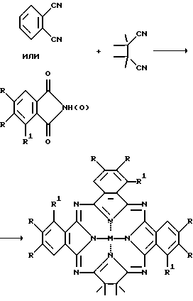 , , ![]() , ![]() -Тетраметилтриаренотетраазахлорины общей формулы![]() где M = HH, Cu, Ni, VO; R = R1 = H; ![]() 2. Способ получения безметального соединения по п.1, где М = НН, R = R1 = H, заключающийся в конденсации смеси тетраметилсукцинонитрила с фталонитрилом в присутствии диметиламиноэтилата лития в диметиламиноэтаноле. 3. Способ получения соединений по п.1, где М = Сu, Ni, VO, R = R1 = H, заключающийся в конденсации смеси тетраметилсукцинонитрила с фталонитрилом в мольном соотношении от 1:2 до 2:1 в присутствии хлоридов никеля, ванадия или меди и каталитических количеств молибдата аммония в высококипящих органических растворителях. 4. Способ получения соединений по п.1, где М = Ni, VO, заключающийся в конденсации смеси тетраметилсукцинонитрила с производными о-фталевой или нафталин-2,3-дикарбоновой кислоты общей формулы ![]() где R = R1 = H; ![]() в присутствии хлоридов никеля или ванадия, мочевины и каталитических количеств молибдата аммония в хинолине или сульфолане. |