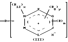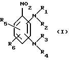 (57) Реферат: Изобретение относится к катионным нитрофенилендиаминовым красителям, которые могут быть использованы в качестве прямых красителей для окраски кератиновых волокон и, в частности, человеческих волос. Описываются катионные монобензольные нитрофенилендиамины, содержащие, по меньшей мере, одну катионную группу Z, выбранную из группы кватернизованных ненасыщенных азотсодержащих циклических групп и кватернизованных алифатических групп, причем когда алкильная цепь содержит кетонную группу, то кетонная группа не связана непосредственно с атомом азота аминогрупп или с атомом кислорода группы OR7 в фенильном кольце. Описываются также красящая композиция для кератинового волокна и способ окрашивания кератинового волокна. Предлагаемые красители обладают повышенной растворимостью в красящих средах и обеспечивают окраску повышенного качества по сравнению с известными катионными нитрофенилендиаминами, катионный заряд которых локализован на атоме азота алифатической цепи или моноазотсодержащего гетероцикла. 4 с. и 12 з.п. ф-лы, 33 табл. Изобретение относится к монобензольным нитрофенилендиаминам, содержащим, по меньшей мере, одну катионную группу, выбранную из алифатических цепей, содержащих, по крайней мере, один перемещенный катионный заряд на ненасыщенном полиазотсодержащем гетероцикле с 5 звеньями, к их применению в качестве прямого красителя при окрашивании кератиновых веществ, в частности кератиновых волокон человека, в частности волос, и еще более конкретно к содержащим их красящим композициям. Известно окрашивание кератиновых волокон, в частности волос, при помощи красящих композиций, содержащих прямые красители, то есть красящие молекулы, обладающие сродством к указанным волокнам. Способ окрашивания, при котором они применяются, представляет собой так называемый способ прямого окрашивания, заключающийся в том, что прямые красители наносят на волокна на определенное время, затем волокна прополаскивают. Получаемые при этом окраски представляют собой временные или полуперманентные окраски, так как природа взаимодействия между прямыми красителями и кератиновым волокном, а также их десорбция с поверхности и/или из сердцевины волокна обуславливают их слабые красящие возможности и их плохую устойчивость к мытью или потению. Среди известных прямых красителей катионные нитрофенилендиамины, разумеется, уже были описаны, но в случае, когда их катионный заряд был локализован на атоме азота алифатической цепи или моноазотсодержащего гетероцикла. Такие нитрофенилендиамины, например, были описаны в патентах: английском 1164824 и американском 4018556. Тем временем, в области окрашивания волос постоянно производятся исследования, направленные на получение прямых красителей, обладающих все лучшими характеристиками. После серьезных исследований, проведенных в этой области, заявитель, наконец, обнаружил совершенно неожиданным и удивительным образом новые катионные монобензольные нитрофенилендиамины, в которых, по меньшей мере, один катионный заряд перемещен на ненасыщенный полиазотсодержащий гетероцикл с 5 звеньями и которые содержат, по меньшей мере, одну катионную группу Z, где Z выбрано из кватернизованных алифатических цепей, таких, которые содержат по меньшей мере один насыщенный кватернизованный цикл