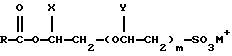 СТРУЖКА ПОВЕРХНОСТНО-АКТИВНЫХ ВЕЩЕСТВКак указывалось, в готовых брусках содержится 1 – 30% активирующей добавки. Остальные ингредиенты, образующие окончательные композиции для брусков (т. е. от около 99 до 70% стружки) включают стружку, которая, как правило, включает комплекс (систему) поверхностно-активных веществ, которые составляют основную часть моющего бруска. В частности, стружка с комплексом поверхностно-активных веществ включает от около 5 до 90 вес.% комплекса поверхностно-активных веществ, в котором поверхностно-активное вещество выбирают из группы, состоящей из мыла (включая системы поверхностно-активных веществ, состоящие только из мыла), анионогенного поверхностно-активного вещества, неионогенного поверхностно-активного вещества, амфотерного/цвиттерионного поверхностно-активного вещества, катионогенного поверхностно-активного вещества и их смесей. Эта стружка может дополнительно содержать другие компоненты, которые обычно содержатся в готовой композиции для моющих брусков, например микроколичества ароматизаторов, консервантов, полимеров, делающих бруски приятными на ощупь и т.п. СИСТЕМА (КОМПОЗИЦИЯ) ПОВЕРХНОСТНО-АКТИВНЫХ ВЕЩЕСТВ Термин “мыло” используется в данном описании в его обычном смысле, т.е. обозначает соли щелочного металла или алканоламмониевые соли алифатических алкан- или алкенмонокарбоновых кислот. Катионы натрия, калия, моно-, ди- и триэтаноламмония или их комбинации подходят для целей настоящего изобретения. Как правило, в композициях по настоящему изобретению используют натриевые мыла, но от около 1 до около 25% мыла могут составлять калиевые мыла. Мыла, используемые в настоящем изобретении, представляют собой хорошо известные соли щелочных металлов и натуральных или синтетических алифатических (алкановых или алкеновых) кислот, имеющих от около 12 до 22 атомов углерода, предпочтительно от около 12 до 18 атомов углерода. Их можно описать как карбоксилаты щелочных металлов и акриловых углеводородов, имеющие от около 12 до около 22 атомов углерода. Мыла, имеющие жирнокислотное распределение кокосового масла, могут представлять нижнюю границу широкого диапазона молекулярных масс. Те мыла, которые имеют жирнокислотное распределение арахисового или рапсового масла, или их гидрированные производные могут представлять верхнюю границу широкого диапазона молекулярных масс. Предпочтительно использовать мыла, имеющие жирнокислотное распределение кокосового масла или твердого животного жира, или их смеси, поскольку эти жиры относятся к самым доступным. Содержание жирных кислот, имеющих по меньшей мере 12 атомов углерода, в мыле из кокосового масла составляет около 85%. Это значение будет выше, если используют смеси кокосового масла и жиров, таких как твердый животный жир, пальмовое масло или масла или жиры из нетропических видов орехов, у которых длина главной цепи жирных кислот составляет C16 и выше. Предпочтительное мыло для использования в композициях по настоящему изобретению содержит по меньшей мере около 85% жирных кислот, имеющих от около 12 до 18 атомов углерода. Кокосовое масло, применяющееся для изготовления мыла, можно целиком или полностью заменить другими “привлекательными” видами масел, т.е. такими маслами или жирами, в которых по меньшей мере 50% от общего количества жирных кислот пре