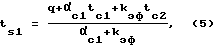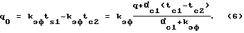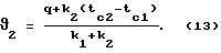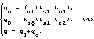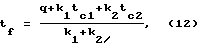 Для упрощения расчетов представим удельные проводимости (коэффициенты теплоотдачи 2 и c2) в правой части цепи в виде эффективного коэффициента теплопередачи k2 [10]:![]() В свою очередь, все элементы правее узла ts1 на схеме на фиг.2 можно объединить и описать одной эффективной величиной: ![]() Тогда баланс потоков в левом и правом относительно узла ts1 плече схемы можно представить в виде системы уравнений: ![]() Из решения системы уравнений (4) можно получить величину температуры станки ts1 и потока q0: ![]() ![]() Из рисунка, приведенного на фиг.2, видно, что ![]() откуда можно определить конечную искомую величину достижимого перегрева подвижного теплоносителя для прототипа 1:![]() Подставив в (8) величину q0 из (6), окончательно получим: ![]() где ![]() 2. Заявляемое техническое решение При внутреннем тепловыделении источник теплового потока подводится не к точке ts1, а к точке tf (фиг.3). Для упрощения расчетов кроме величины k2 (2) вводится коэффициент теплопередачи k1 (10) для левой относительно узла tf части схемы, с учетом которого баланс потоков в тепловой схеме упрощается: ![]() Решение системы позволяет получить выражение для tf и 2 ( 2 – искомая величина достижимого перегрева подвижного теплоносителя для заявляемого технического решения):![]() ![]() 3. Сопоставление прототипа и заявляемого технического решения Проведем сопоставление для простейшего случая симметрии условий теплообмена на левой и правой стенках в обоих вариантах, то есть будем считать, что ![]() Тогда (9) и (13) упростятся до вида: ![]() Отношение 2 к 1 равно:![]() Как видно из (16), всегда выполняется условие >1, (17)то есть задача изобретения действительно решается в заявляемом техническом решении, причем, чем хуже теплоизолирована система (чем выше c), тем больший выигрыш обеспечивает заявляемый автономный нагреватель по сравнению с прототипом.