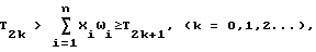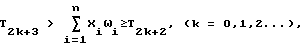 При поступлении на входные клеммы 24 многопорогового логического элемента двоичного набора, состоящего из одних нулей, диоды 1 проводят ток от источника смещения 4 через соответствующие резисторы 3. На входах 8 однопороговых дискриминаторов 7 присутствует потенциал логического нуля, одновибратор 18 находится в стабильном состоянии, нулевой сигнал с выхода многовходового логического элемента И-НЕ 14 устанавливает RS-триггер в единичное состояние, что приводит к появлению в клемме 23 высокого уровня сигнала, соответствующего “логической единице”. Пусть теперь на входные клеммы 24 подан такой набор переменных, что![]() где X -значение входной переменной, – вес i-го входа, T1, T2 – пороги срабатывания первого и второго однопороговых дискриминаторов.