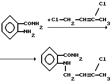 (57) Реферат: Изобретение относится к области органической химии, к классу амидов ароматических аминокислот, а именно к новому биологически активному амиду N-(3′-хлорбутен-2′-ил)-антраниловой кислоты, обладающему противовоспалительной активностью, который может найти применение в медицине. Соединение практически нетоксично и по противовоспалительной активности равно ортофену и превосходит аналог по структуре. 1 табл. Заявляемое соединение относится к области органической химии, к классу амидов ароматических аминокислот, а именно к новому биологически активному амиду N-(3′-хлорбутен-2′-ил)-антраниловой кислоты, которое может найти применение в качестве основы нового лекарственного средства следующей формулы: ![]() Ближайшим структурным аналогом заявляемого соединения является натриевая соль N-(3′-хлорбутен-2′-ил)-антраниловой кислоты, проявляющая противовоспалительную активность [Авторское свидетельство 1783774, 1990]. ![]() В лечебной практике применяется противовоспалительное средство ортофен [Машковский М. Д. Лекарственные средства (пособие по фармакотерапии для врачей), М. , ” Медицина”, Т. 1., С. 172, (1997], который взят нами в качестве эталона сравнения. Целью предлагаемого изобретения является получение нового амида N-(3′-хлорбутен-2′-ил)-антраниловой кислоты, обладающего противовоспалительным действием. Поставленная цель достигается путем взаимодействия амида антраниловой кислоты с 1,3-дихлорбутеном-2 с образованием амида N-(3′-хлорбутен-2′-ил)-антраниловой кислоты: ![]() К раствору из 0,68 г (0,005 моль) амида антраниловой кислоты и 20 мл горячей воды при постоянном перемешивании по каплям добавляют 0,69 г (0,0055моль) 1,3-дихлорбутена-2 при комнатной температуре в течение 1 ч. Полученную смесь нейтрализуют карбонатом натрия. Образовавшийся осадок отфильтровывают и перекристаллизовывают из смеси воды с этанолом (2:1). Выход 52,8%. Т.пл. 122-4oС, найдено, %: Cl 15,54; N 12,25; вычислено, %: Cl 15,78; N 12,47. ИК-спектр, max, см-1: 1520, 1580, 1620, 1670, 3050, 3380. ПМР-спектр, CDCl3, , м.д.: 2,0 с (3Н, СН3); 3,7 д (2Н,СН2); 5,5 т (1Н, СН=); 5,90-7,76 м (7Н, 4Н аром, NH, NH2).