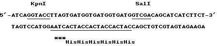 Рекомбинантная плазмидная ДНК pU11HHV6, кодирующая иммунодоминантную часть белка тегумента р100 герпесвируса человека, характеризуется следующими признаками (фиг.1):– имеет молекулярную массу 2,95 мегадальтон (4,468 т. п. о.); – кодирует аминокислотную последовательность иммунодоминантной части белка p100 HHV-6 (с 494 по 842 а. к.); – состоит из: – HindIII/EcoRV – фрагмента ДНК плазмидного вектора pUR290 (3396 т. п. о.)[5]; – PCR-фрагмента гена U11 (1050 п.о.), кодирующего всю иммунодоминантную часть белка p100 HHV-6 (с 494 по 842 а. к.); – содержит: – в качестве генетического маркера ген blа -лактамазы, определяющий устойчивость трансформированных плазмидой pU11HHV6 клеток к ампициллину;– нуклеотидную последовательность, которая находится в рамке считывания гена U11 и кодирует полигистидиновый тракт L44, состоящий из 6 молекул гистидина; – уникальные сайты узнавания рестрикционными эндонуклеазами, имеющие следующие координаты: Bgl 11 (AGATCT) – 1500, 2199; EcoR I (GAATTC) – 2021; Sma I (CCCGGG) – 2177. Существенными преимуществами предложенной плазмидной конструкции по сравнению с прототипом являются наличие экспрессируемого фрагмента гена U11, кодирующего только иммунодоминантную часть белка p100 HHV-6, наличие в С-концевой области полигистидинового тракта, что в совокупности обеспечивает уровень синтеза целевого антигена 40-50% с выходом очищенного продукта после аффинной хроматографии до 98-99% от суммарных клеточных белков. Перечень графических материалов. Фиг.1. Физическая карта рекомбинантной плазмиды pU11HHV-6. Фиг. 2. Нуклеотидная последовательность гена U 11, кодирующая иммунодоминантную часть белка р100. Фиг. 3. Аминокислотная последовательность иммунодоминантного фрагмента белка p100 HVV-6, кодируемого рекомбинантной плазмидой pU11HVV-6. Фиг.4. Электрофореграмма лизатов клеток Е.coli (штамм TG-1) Дорожки М: маркер белковых весов (Sigma). Дорожки. К: контроль бактериальных белков – клеточный лизат E.coli. Дорожки 1-2: клеточные лизаты бактериальных штаммов-продуцентов рекомбинантных антигенов. 1: штамм, содержащий плазмиду pUR-Р100. 2: штамм, содержащий плазмиду рР100. Дорожки 3: хроматографически очищенный рекомбинантный белок p100. Изобретение иллюстрируется следующими примерами. Пример 1. Конструирование промежуточной плазмидной ДНК pUR290-6*his, кодирующей последовательность из 6 гистидинов после сайта узнавания энлонуклеазой рестрикции Sail. 10 мкг плазмидной ДНК pUR290 [5] обрабатывают последовательно эндонуклеазой рестрикции HindIII, фрагментом Кленова и SalI, и сшивают с синтетическим адаптером длинной 50 пар нуклеотидов, обработанным последовательно эндонуклеазой рестрикции KpnI, фрагментом Кленова и SalI: ![]() в лигазной реакции в 20 мкл лигазного буфера. 10 мкл лигазной смеси используют для трансформации компетентных клеток E. coli TG-1 [4]. Трансформанты высевают на LB-агар, содержащий 100 мкг/мл ампициллина. Из выросших за 1 сутки колоний клонов выделяют плазмидную ДНК. ДНК каждого клона проверяют на присутствие вставки 116 п.н., обрабатывая эндонуклеазой рестрикции EcoRI, и на отсутствие сайта эндонуклеазы рестрикции PstI. Отбирают клон, плазмидная ДНК которого содержит последовательность синтетического адаптера. Пример 2. Конструирование рекомбинантной плазмидной ДНК рU11HHV6. 10 мкг плазмидной ДНК pUR290-6*his обрабатывают рестриктазами BamHI и SalI в соответствии с методикой, описанной в работе [4], и из полученного гидролизата выделяют в 4% полиакриламидном геле 
