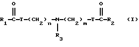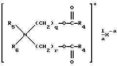 ![]() где R1 и R2 представляют собой С12-С30 алифатические углеводородные группы; R3 – (СН2СН2О)рН, СН3 или Н; Т – O или NH; n = 1-5; m = 1-5; р = 1-10; и (В) представляет собой способное разлагаться биологическим способом четвертичное аммониевое соединение сложного жирного эфира формулы ![]() где каждый R4 независимо представляет собой алифатическую углеводородную группу, содержащую от 8 до 22 атомов углерода; R5 – (СН2)s-R7 (где R7 – алкоксикарбонильная группа, содержащая от 8 до 22 атомов углерода, бензил, фенил, замещенный фенил, содержащий в качестве заместителя (С1-С4)алкил, ОН или Н); R6 – (СН2)t-R8 (где R8 – бензил, фенил, замещенный фенил, содержащий в качестве заместителя (С1 -С4)алкил, ОН или Н); q, r, s и t каждый независимо представляет собой целое число от 1 до 3; Х-a – анион с валентностью а, и где по меньшей мере приблизительно 20% углеводородных заместителей, присутствующих в компонентах А и В, являются ненасыщенными; (ii) сложный жирный эфир одноатомных или многоатомных спиртов, содержащих углеводородную цепь, включающую от 1 до приблизительно 24 атомов углерода, и моно- или поликарбоновых кислот, содержащих углеводородную цепь, включающую от 1 до приблизительно 24 атомов углерода, при условии, что общее количество атомов углерода в сложном эфире равно или больше 16 и что по меньшей мере один из углеводородных радикалов в сложном эфире содержит 12 или более атомов углерода, причем указанный сложный жирный эфир присутствует в композиции так, что весовое соотношение компонента (i) и компонента (ii) находится в интервале 40: 1 – 5: 1; и (iii) водный носитель, включающий электролит в количестве, которое предотвращает желатинирование композиции. 2. Композиция по п. 1, отличающаяся тем, что в соединении формулы A Т= NH; R1 и R2= С16-С22 алкил или алкенил; m = 1-3; n = 1-3; R3 = (СН2СН2О)рН и р = 1,5-3,5. 3. Композиция по п. 1, отличающаяся тем, что в соединении формулы В R5 и R6 выбирают из группы, включающей С1 – С3 алкил и СН2СН2ОН, причем по меньшей мере один или оба R5 и R6 представляют собой СН2СН2ОН; R4 – алифатический углеводород, содержащий от 14 до 18 атомов углерода, и Х – анион, выбранный из группы, включающей галогенид, сульфат, метосульфат, нитрат, ацетат, фосфат, бензоат или олеат. 4. Композиция по п. 1, отличающаяся тем, что весовое соотношение (А): (В) находится в интервале значений от приблизительно 5: 1 до приблизительно 1: 5, причем общее количество ненасыщения составляет менее 70% групп алифатического углеводорода, присутствующих в (А) и (В). 5. Композиция по п. 1, отличающаяся тем, что общее количество (А) и (В) заключается в интервале значений от приблизительно 4 до приблизительно 30% (мас. ) из расчета на всю композицию. 6. Композиция по п. 5, отличающаяся тем, что весовое соотношение компонента (i) и компонента (ii) находится в интервале от приблизительно 28: 1 до приблизительно 9: 1. 7. Композиция по п. 4, отличающаяся тем, что весовое соотношение (А): (В) заключается в интервале от приблизительно 2: 1 до приблизительно 1: 2. 8. Композиция по п. 1, отличающаяся тем, что компонент сложного жирного эфира (ii) выбирают из группы, включающей сложные жирные эфиры С16-С18 ненасыщенных жирных кислот и С1-С8 одноатомных или многоатомных спиртов. 9. Композиция по п. 8, отличающаяся тем, что жирная кислота сложного эфира имеет величину гидрофильно-липофильного баланса в интервале от приблизительно 0,5 до 5. 10. Композиция по п. 8, отличающаяся тем, что жирный спирт 