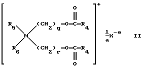 Регулирование вязкости и повышение смягчающей силы в таких водных композициях достигается сочетанием амидоамина или аминопроизводного сложного эфира формулы I, приведенной выше, со способным подвергаться биологическому разложению четвертичным аммониевым производным сложного жирного эфира (этеркватом) формулы II![]() где каждый R4 независимо представляет собой алифатическую углеводородную группу, содержащую от 8 до 22 атомов углерода; R5 представляет собой (СН2)s-R7 (где R7 – алкоксикарбонильная группа, содержащая от 8 до 22 атомов углерода, бензил, фенил, замещенный фенил, содержащий в качестве заместителя (C1-C4)алкил, ОН или Н); R6 представляет собой (CH2)t-R8 (где R8 – бензил, фенил, замещенный фенил, содержащий в качестве заместителя (C1-С4)алкил, ОН или Н); q, r, s и t каждый независимо представляет собой целое число от 1 до 3; и X-a представляет собой анион с валентностью а. Такие композиции, содержащие компоненты формулы I и формулы II, содержат также электролитную соль в качестве реагента, предотвращающего желатинирование для обеспечения повышения величины уменьшения вязкости. В патентах NN 5133885 и 5501806 описываются водоосновные концентраты смягчителей тканей, содержащие различные описанные выше амидоамины или аминопроизводные сложных эфиров и этеркватные соединения. Смягчители ткани (в форме концентрата или готовые к применению) обычно приготавливают в форме водных дисперсий (макроэмульсий), и они содержат также от приблизительно 0,25 до приблизительно 3% (мас.) добавленной масляноосновной отдушки для увеличения привлекательности для потребителя. Рецептуры в форме концентратов, подлежащие разбавлению потребителем перед применением, обычно содержат большое количество отдушки, например от 1 до 3% (мас.). Обычные отдушки представляют собой обладающие запахом материалы на основе цветочных экстрактов или материалы древесно-растительного происхождения, содержащие экзотические материалы, такие как масло сандалового дерева, цибет или масло пачули. Отдушку обычно добавляют в расплавленную смесь смягчающих агентов непосредственно перед эмульгированием в воде. Однако в некоторых случаях необходимо приготавливать рецептуру водных дисперсий состава амидоамин или аминопроизводное сложного эфира/этеркват без добавления какой-либо отдушки или с очень небольшим ее добавлением. Это позволило бы производителю приготавливать большие количества маточного тканевого смягчителя, части которого могли бы затем соединяться с отдушками различных типов для удовлетворения различных потребностей различных потребителей. Получение рецептур, не содержащих отдушки, позволило бы потребителю выбрать один из нескольких различных запахов отдушек, поставляемых вместе с продуктом, и смешивать нужный запах с композицией смягчителя ткани перед применением. Такие композиции смягчителя ткани, стабильные в отсутствие масляной отдушки, известны, например, из ЕР 0634475 А2, 18.01.95. Однако попытки получить эмульсионные маточные смеси, содержащие смягчающие агенты состава амидоамин или аминопроизводное сложного эфира/этеркват, описанные выше, без добавления отдушки показали, что присутствие отдушки необходимо для того, чтобы получить эмульсии, обладающие стабильной вязкостью. Установлено, что отдушка обладает физико-химическим действием при получении эмульсий, которые
