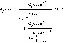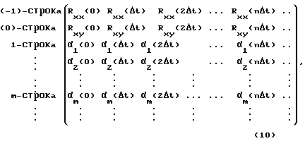 По окончании процедуры стационаризации входного и выходного сигналов находится модель идентифицируемого объекта в идентификаторе непрерывной дроби. Для этого на основании (1) расчетным путем определяется идентифицирующая матрица:![]() в которой (-l)-стpoкa и (0)-строка содержат значения корреляционной функции входного сигнала Rхх(k t) и взаимной корреляционной функции входного и выходного сигналов Rху(k t) в моменты времени {n t}N0 и они являются начальными условиями при построении матрицы, а элементы m((n t)) последовательно определяются с помощью соотношений вида (2), где -1(n t) = Rxx(n t), 0(n t) = Rxy(n t), m= 1,2,3, . .., a n=0,1,2,… Тогда элементы первого столбца матрицы (10) порождают частные числители правильной С-дроби и ДПФ преобразователя разностей будет иметь вид![]() При аппроксимации дробно-рациональной функции в матрице (10) наблюдается появление нулевой строки, номер которой позволяет идентифицировать порядок функции. Если в некоторой i-той строке (i=0,1,2,…) матрицы (10) конечное число ki, первых элементов равны нулю, а последующие элементы отличны от нуля, то необходимо осуществить сдвиг влево на ki, элементов до появления в нулевом столбце ненулевого элемента и далее продолжить определение других элементов матрицы (10) по правилу (2). Для i-той строки при восстановлении правильной С-дроби (11) элемент i(0) умножается на ![]() Получив ДПФ преобразователя разностей, с помощью обратных разностных преобразований переходят к ДПФ объекта и далее к прогнозирующей модели в виде разностного уравнения (4), которая позволяет восстанавливать значения модельного сигнала yм(k t) на выходе модели.