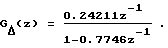 Аналоговый объект идентификации – интегрирующий операционный усилитель с передаточной функцией![]() на вход которого подается случайный сигнал, дискретная модель которого имеет вид x(k)=2a(k)+0.36788 x(k-l), где a(k) – белый шум с математическим ожиданием Ма=0 и дисперсией Da=1, а на выходе имеется случайный сигнал, заданный разностным уравнением y(k)=0.63212x(k-l)+y(k-l). (12) На основании дискретных моделей входного и выходного сигналов моделировались реализации x(k t) и y(k t) объемом N=90 с шагом дискретизации t= 1c. По полученным реализациям вычисляются значения структурных функций Cх(k t) и Cy(k t) по формулам (5) и (6) соответственно. На фиг.2 непрерывной линией изображена структурная функция Cх(k t), а пунктиром ее вид после сглаживания фильтром низких частот. Применим модифицированный алгоритм В. Висковатова для аппроксимации непрерывной дробью модели структурной функции входного сигнала. Для этого определим матрицу (7) с учетом того, что в нулевой строке необходимо сделать сдвиг влево на один элемент, обусловленный начальным значениемCx(0)=0,![]() в которой 2-ую строку можно считать нулевой. На основании элементов первого столбца матрицы аппроксимируем непрерывной дробью модель структурной функции входного сигнала в форме ДПФ объекта преобразователя ![]() ДПФ объекта-преобразователя имеет один полюс zn=032913, на основании значения которого можно сделать вывод об устойчивости объекта-преобразователя и, следовательно, о стационарности входного сигнала. На фиг. 3 непрерывной линией изображена структурная функция Сy(k t), а пунктиром ее вид после сглаживания фильтром низким частот. Аналогичным образом определим матрицу вида (7)![]() в которой 2-ую строку можно считать близкой к нулевой (при расчете элементов следующей строки их значения резко возрастают). Тогда модель структурной функции выходного сигнала в форме ДПФ объекта-преобразователя имеет вид ![]() Так как полюс ДПФ объекта-преобразователя лежит вне единичной окружности, можно сделать вывод о неустойчивости объекта. Следовательно, выходной сигнал нестационарен. Применим процедуру стационаризации y(k)=y(k+1)-y(k),![]() после чего вновь вычислим и сгладим структурную функцию выходного сигнала (фиг.4). Матрица (7) будет иметь вид ![]() ДПФ объекта-преобразователя имеет вид ![]() zn=037453, следовательно, сигнал стационарен. По окончании процедуры стационаризации выходного сигнала находится модель идентифицируемого объекта. Для этого вычисляются детерминированные характеристики корреляции – взаимная корреляционная функция входного и выходного сигналов Rxy(k t) и корреляционная функция входного сигнала Rxx(k t), а затем расчетным путем определяется идентифицирующая матрица (10)![]() в которой (-1)-строка и (0)-строка содержат значения корреляционной функции входного сигнала Rxx(k t) и взаимной корреляционной функции входного и выходного сигналов Rxy(k t). Тогда ДПФ преобразователя разностей будет иметь вид![]() а прогнозирующая модель в разностях: yм(k)=0.63306.