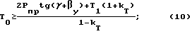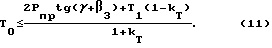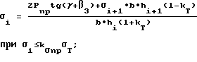 В свою очередь, величину угла можно определить из выражения:![]() где Rраб – радиус рабочего валка, м; е – расстояние между вертикальными осевыми плоскостями рабочего и опорного валков, м. Как видно из чертежа и выражения (1), если полуразность натяжений полосы больше горизонтальной проекции межвалкового усилия, радиальное усилие действует по направлению прокатки; если полуразность натяжений меньше горизонтальной проекции межвалкового усилия, радиальное усилие направлено в противоположную сторону. В процессе прокатки натяжение полосы не является постоянным, под воздействием колебаний режимов прокатки имеют место колебания натяжений, которые в зависимости от типа стана могут составлять до 20% от номинальных величин. Установив максимальное для стана отклонение величин натяжений от соответствующего номинального, величины максимального, минимального и среднего (номинального) натяжений можно связать между собой следующими соотношениями: ![]() где kT – коэффициент нестабильности натяжений; Т0max,Т0min – максимальная и минимальная величина заднего натяжения, Н; Т1max,Т1min – максимальная и минимальная величина переднего натяжения, Н; Т0,Т1 – средние (номинальные) значения натяжений, установленные технологической инструкцией, Н. При колебаниях натяжения, а также во время ускорения и замедления стана возможно изменение направления действия радиального усилия, что приводит к снижению качества поверхности прокатываемой полосы за счет неустойчивого положения рабочих валков в клети и колебаний межвалкового зазора. Величины удельных натяжений, обеспечивающих стабильное положение валка в клети, определены из условия, что при ускорении и замедлении стана радиальные усилия не изменяют своего направления, причем расчет произведен для наиболее неблагоприятных вариантов. 1. Если полуразность натяжений больше горизонтальной проекции межвалкового усилия, то радиальное усилие действует на подшипники по направлению прокатки, и наименьшая возможная разность натяжений при ускорении стана будет равна (T0min-T1max); в этом случае условие устойчивости рабочего валка имеет вид: ![]() 2. Если полуразность натяжений меньше горизонтальной проекции межвалкового усилия, то радиальное усилие действует на подшипники против направления прокатки, и наибольшая возможная разность натяжений при замедлении стана будет равна (T0max-T1min); в этом случае условие устойчивости рабочего валка имеет вид: ![]() Если технологической инструкцией стана задана номинальная величина переднего натяжения Т1, то номинальную величину заднего натяжения Т0, гарантирующую устойчивое положение рабочего валка в клети, можно определить из следующих неравенств, полученных путем преобразования выражений (1), (2), (7), (8), (9): ![]() ![]() Учитывая, что y> 3, с целью недопущения порывов полосы при прокатке из-за высокого уровня удельных межклетевых натяжений величину заднего натяжения для каждой клети назначают исходя из условия (11). В этом случае, используя зависимость i = Ti/(b hi), получаем указанное в формуле изобретения выражение для определения величины удельного заднего натяжения.