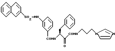 Пример 8(S)-3-(2-нафтил)-сульфонамидо-N-1-N-(3-(имидазол-1-ил-пропан-1-ил)-карбамоил-1-оксо-3-фенил-пропан-2-ил)-бензамид ![]() а) Сложный этиловый эфир 3-(S)-3-амино-2-гидрокси-4-фенилмасляной кислоты 28 г (0,12 моль) 3-(S)-3-амино-2-гидрокси-4-фенилмасляной кислоты (см. С. Л. Харбезон и др., J.Med.Chem. 1994, 37, стр.2918-29) кипятят с обратным холодильником 3 часа в 500 мл 1М этанольного раствора хлористого водорода. После этого реакционную смесь концентрируют под вакуумом и остаток распределяют между водой и этилацетатом. Этилацетатную фазу подщелачивают водным раствором бикарбоната натрия. При этом выделяется масло. Это масло обрабатывают этилацетатом, сушат и концентрируют под вакуумом. Выход: 18 г. б) 3-(нафт-2-ил)-сульфонамидо-N-(2-(S)-1-этоксикарбонил-1-гидрокси-3-фенил-пропан-2-ил)-бензамид 16,5 г (50,4 ммоль) промежуточного продукта стадии б) примера 7 и 11,2 г (50,4 ммоль) соединения, полученного на стадии а), подвергают реакции аналогично стадии в) примера 2. Получают 7,8 г (30%) продукта. в) 3-(2-нафтил)-сульфонамидо-N-(2-(S)-1-карбокси-1-гидрокси-3-фенил-пропан-2-ил)-бензамид 7,8 г (14,6 ммоль) промежуточного соединения, полученного на стадии б), растворяют в 150 мл тетрагидрофурана и смешивают с 1,1 г (44 ммоль) гидроокиси лития, растворенной в 20 мл воды. Реакционную смесь перемешивают 1 час при комнатной температуре. Органический растворитель удаляют под вакуумом и водную фазу слабо окисляют посредством 1М соляной кислоты. Полученный осадок отсасывают. Выход продукта составляет 7,2 г (98%). г) 3-(нафт-2-ил)-сульфонамидо-N-(2-(S)-1-N-(3-(имидазол-1)-ил-пропан-1-ил)-карбамоил-1-гидрокси-3-фенил-пропан-2-ил)-бензамид 1 г (2 ммоль) промежуточного соединения, полученного на стадии в), подвергают взаимодействию аналогично стадии в) примера 2 с 3-аминопропан-1-ил-1-имидазолом. Выход: 0,63 г (53%). д) (S)-3-(2-нафтил)-сульфонамидо-N-(1-N-(3-(имидазол-1-ил-пропан-1-ил)-карбамоил-1-оксо-3-фенилпропан-2-ил)-бензамид 0,6 г (0,98 ммоль) промежуточного соединения стадии г) окисляют аналогично стадии е) примера 1, при этом получают 0,55 г (92%) продукта. Пример 9 (S)-N-(1-N-(N-бензил-пиперидин-4-ил)-карбамоил-1-оксо-3-фенил-пропан-2-ил)-3-(нафт-2-ил-)сульфонамидо)-бензамид ![]() а) N-(2-(S)-1-N-(N-бензил-пиперидин-4-ил)-карбамоил-1-гидрокси-3-фенил-пропан-2-ил)-3-(нафт-2-ил)сульфонамидо-бензамид 1 г (2 ммоль) промежуточного соединения, полученного на стадии в) примера 8, и 4-амино-N-бензилпиперидин подвергают реакции аналогично стадии в) примера 2, при этом получают 0,67 г (50%) продукта. б) (S)-N-(1-N-(N-бензил-пиперидин-4-ил)-карбамоил-1-оксо-3-фенил-пропан-2-ил)-3-(нафт-2-ил)-сульфонамидо)-бензамид 0,65 г (1 ммоль) промежуточного соединения стадии а) подвергают окислению аналогично стадии е) примера 1 и получают 0,59 г (91%) продукта. Пример 10 (S)-2-(Е-2-(3,4-диметоксифенил)-этен-1-ил)-N-(1-N-(3-морфолино-1-ил-пропан-1-ил)-карбамоил)-1-оксо-3-фенил-пропан-2-ил)-бензамид ![]() а) 2-(Е-2-(3,4-диметоксифенил)-этен-1-ил)-N-(2-(S)-1-N-(3-морфолино-1-ил-пропан-1-ил)-карбамоил)-1-гидрокси-3-фенил-пропан-2-ил)-бензамид 1,7 г (6 ммоль) промежуточного соединения, полученного на стадии б) примера 3, подвергают взаимодействию аналогично стадии в) примера 2 с соединением, полученным на стадии б) примера 2, при этом получают 1,2 г (34%) продукта. б) (S)-2-(Е-2-(3,4-диметоксифенил)-этен-1-ил)-N-(1-N-(3-морфолино-1-ил-пропан-1-ил)-карбамоил)-1-оксо-3-фенил-пропан-2-ил)-бензамид 0,6 г (1 ммоль) промежуточного соединения окисляют аналогично стадии е) примера 1 и получают 0,12 г (20%) продукта. 1H-ЯМР (СDСl3): = 1,8 (2Н), 2,4-2,7 (6Н), 3,1 (1Н),