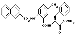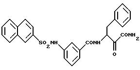 Пример 24(S)-N-(1-этоксикарбонил-1-оксо-3-фенил-пропан-2-ил)-2-фенил-бензамид ![]() а) N-(3-(S)-1-этоксикарбонил-1-гидрокси-3-фенил-пропан-2-ил)-2-фенил-бензамид Бифенил-2-карбоновую кислоту подвергают взаимодействию аналогично стадии в) примера 2 со сложным метиловым эфиром 3-(S)-3-амино-2-гидрокси-4-фенилмасляной кислоты. б) (S)-N-(1-этоксикарбонил-1-оксо-3-фенил-пропан-2-ил)-2-фенил-бензамид Промежуточное соединение со стадии а) окисляют аналогично стадии е) примера 1. МС: m/e = 387 (М+). Пример 25 (S)-N-(N-карбоксиметил-1-карбамоил-1-оксо-3-фенил-пропан-2-ил)-3-(2-нафтилсульфонамидо)-бензамид ![]() а) O-трет.-бутил-N-(3-(S)-1-этоксикарбонил-2-гидрокси-4-фенилпропан-2-ил)-уретан 2,3 г (7,7 ммоль) O-трет.-бутил-N-(3-(S)-1-карбокси-2-гидрокси-4-фенилпропан-2-ил)-уретана и 1,1 г (7,7 ммоль) гидрохлорида сложного глицинэтилового эфира подвергают взаимодействию аналогично стадии в) примера 2. При этом получают 1,7 г (57%) продукта. б) Амид 3-(S)-3-амино-N-(этоксикарбонилметил)-2-гидрокси-4-фенилмасляной кислоты х трифторуксусная кислота 1,4 г (3,7 ммоль) промежуточного соединения со стадии 25а растворяют в 25 мл метиленхлорида и после добавления 10 мл трифторуксусной кислоты перемешивают в течение 2 часов при комнатной температуре. После этого смесь концентрируют под вакуумом, получают 1,5 г (100%) продукта. в) (S)-N-(1-(N-этоксикарбонилметил-карбамоил)-1-гидрокси-3-фенил-пропан-2-ил)-3-(2-нафтил-сульфонамидо)-бензамид Промежуточное соединение со стадии б) примера 7 подвергают взаимодействию аналогично стадии в) примера 2 с продуктом стадии б). Выход составляет 1,3 г. г) (S)-N-(1-(N-карбоксиметил-карбамоил)-1-гидрокси-3-фенил-пропан-2-ил)-3-(2-нафтилсульфонамидо)-бензамид 1,2 г (2 ммоль) промежуточного соединения со стадии в) подвергают гидролизу аналогично стадии в) примера 8 гидроокисью лития. Выход продукта составляет 0,77 г (67%). д) (S)-N-(1-(N-карбоксиметил-карбамоил)-1-оксо-3-фенил-пропан-2-ил)-3-(2-нафтилсульфонамидо)-бензамид 0,7 г (1,2 ммоль) промежуточного соединения со стадии г) окисляют аналогично стадии е) примера 1, при этом получают 0,16 г (23%) продукта. МС: m/e = 559 (М+). Пример 26 N-(1-карбамоил-1-оксо-3-фенил-пропан-2-ил)-3-(2-нафтилсульфонамидо)-бензамид ![]() а) Промежуточное соединение со стадии б) примера 7 подвергают взаимодействию аналогично стадии в) примера 2 со сложным этиловым эфиром 3-амино-2-гидрокси-4-фенилмасляной кислоты. б) N-(N-карбоксиметил-1-карбамоил-1-оксо-3-фенил-пропан-2-ил)-3-(2-нафтилсульфонамидо)-бензамид Промежуточное соединение со стадии а) окисляют аналогично стадии е) примера 1. При этом получают целевой продукт. 1Н-ЯМР (D6-ДМСО): = 2,5 (2Н), 5,2 (1Н), 7,1-8,1 (17Н), 8,4 (2Н), 8,8 (1Н) и 10,5 (1Н) млн.д.