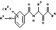 (57) Реферат: Изобретение относится к новым кетобензамидам формулы (1), где R1 означает фенил, нафтил, хинолил, пиридил, хиназолил, хиноксалил, бензотиенил, изохинолин, тетрагидроизохинолин или тетрагидрохинолин, которые могут быть как незамещены, так и замещены, R2 означает водород или алкил, R3 означает алкил, который может нести фениловое кольцо, Х означает связь, -(СH2)m-, -(СН2)m-O-(CH2)0-, -(CH2)n-S-(CH2)m-, -CH= CH-, -CO-CH=CH-, -(CH2)m-NHCO-(CH2)0-, -(CH2)m-CONH-(CH2)0-, -(CH2)m-NHSO2-(CH2)0-, -(CH2)m-SO2NH-(CH2)0-; R4 означает группы OR6, NR7R8; n – число от 0 до 2. Соединения формулы (I) обладают ингибирующей активностью и поэтому представляют собой ингибиторы протеаз цистеина, в частности таких протеаз цистеина, как калпаин 1 и 11 и катепсины В, L. 2 з.п.ф-лы, 1 табл.