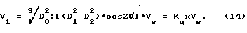 Если потери на нагрев отсутствуют, то к=1, а для стеклянного шара, падающего на стеклянную поверхность к=15:16 0,9375, т.е. 0,0625 от входного количества движения идет на нагрев стекла. Конечно такая модель не может полностью объяснить процессы отражения частиц воздуха от поверхности конусов и требует экспериментальных исследований, но оно дает качественную сторону процесса. Потери энергии зависят от качества поверхности конусов. Если поверхность отполирована, то потери будут меньше, чем для шероховатой. Поскольку плотность “ ” зависит от влажности воздуха, то и потери будут зависеть от влажности воздуха (ветер с дождем или со снегом). Если идеализировать процесс с отсутствием безвозвратных потерь на нагрев, т.е. считать = , то согласно диаграмме фиг.4 и соотношений (7) и (9) получим мощность входного потока усилителя (11)Nв = Pв Vв![]() D20:4, (11)а для выходного потока усилителя (12) N1 = P1x V1в![]() (D21-D22):4, (12)где Pв= 0 Vв 2:2 – давление ветра на входе усилителя скорости ветра;P1x = 0 V21 cos2 :2 – давление ветра на выходе усилителя;Vв – скорость ветра на входе усилителя; V1 – скорость ветра на выходе усилителя. Поскольку потери на нагрев конусов согласно условию идеализации отсутствуют, то N1=Nв, т.е. КПД усилителя равен 1. Приравняв (11) и (12) с учетом зависимости Рв и Р1х от скоростей, получим (13) V3в D20 = V31 (D21-D22) cos2 , (13)из которого получим (14) ![]() где – коэффициент усиления ветра.