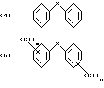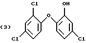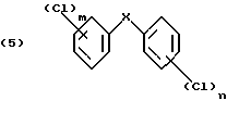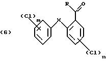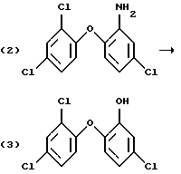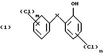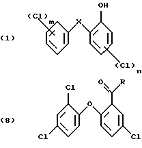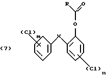 Изобретение относится к получению галоген-о-гидроксидифениловых соединений формулы: ![]() в которой Х- -О- или -СН2-; m – от 1 до 3; и n – 1 или 2; и к применению этих соединений для защиты органических материалов от микроорганизмов или, например, в косметических композициях. Получение галоген-о-гидроксидифениловых соединений, в частности 2-гидрокси-2′, 4,4′-трихлордифенилового эфира (Triclosan; соединения формулы (3) ниже), обычно проводят диазотированием и последующим гидролизом 2-амино-2′, 4,4′-трихлордифенилового эфира (TADE; соединения формулы (2) ниже): ![]() Однако выход в этом способе получения неудовлетворителен, поскольку могут иметь место различные конкурентные химические реакции. Поэтому цель настоящего изобретения – найти экономичный способ получения галоген-о-гидроксидифениловых соединений, в котором подавляются нежелательные побочные реакции. Настоящее изобретение предлагает способ получения галоген-о-гидроксидифениловых соединений, включающий четыре стадии, в котором в первой стадии дифениловое соединение хлорируют; во второй стадии хлорированное соединение ацилируют реакцией Фриделя-Крафтса и его можно вновь хлорировать после ацилирования; в третьей стадии ацильное соединение окисляют; и в четвертой окисленное соединение подвергают гидролизу по схеме 1 реакции, приведенной в конце описания. В схеме1: R – незамещенный С1-С8алкил или С1-С8алкил, замещенный 1-3 атомами галогена или гидрокси; или незамещенный С6-С12арил или С6-С12арил, замещенный 1-3 атомами галогена, С1-С5алкилом или C1-С8алкокси, или их комбинация; Х- -О- или -СН2-; m – от 1 до 3; и n – 1 или 2. С1-С8алкил означает разветвленный или неразветвленный алкил, такой как метил, этил, пропил, изопропил, н-бутил, втор-бутил, изобутил, т-бутил, 2-этилбутил, н-пентил, изопентил, 1-метилпентил, 1,3-диметилбутил, н-гексил, 1-метилгексил, н-гептил, изогептил, 1,1,3,3-тетраметилбутил, 1-метилгептил, 3-метилгептил, 2-этилгексил или н-октил. С1-С8алкокси представляет собой остатки с прямой или разветвленной цепью, такие как метокси, этокси, пропокси, бутокси, пентокси, гексилокси, гептилокси или октилокси. Галоген означает фтор, бром или предпочтительно хлор. В вышеприведенной схеме реакции в формулах (6) и (7) R предпочтительно С1-С4алкил, конкретно метил. В первой стадии реакции в качестве хлорирующего реагента можно применить хлористый сульфурил или лучше газообразный хлор. Реакцию лучше проводить в присутствии катализатора, такого как дибензотиофен, сернистый метил, сернистый пропил, сернистый фенил, кислота по Льюису, например хлорид алюминия, или в смеси таких соединений. В качестве катализатора для реакции хлорирования по изобретению наиболее приемлема смесь сернистого пропила и эквимолярное количество хлорида алюминия. Для реакции в первой стадии температуру можно выбирать в пределах большого диапазона, например от -10 до 50oС. Предпочтительно реакцию проводят при температуре от 0 до 40oС. Время реакции имеет большой диапазон. Обычно реакцию проводят в пределах от 1 до 48, лучше от 2.5 до 10 часов. Реакцию ацилирования (2 стадию) обычно проводят в присутствии кислоты Льюиса, например хлорида алюминия. Кислоту Льюиса можно применять в молярных количествах от 1 до 3, предпочтительно 1.25-2 от количества хлорированного соединения формулы (5). Подходящим ацилирующим реагентом в этой реакции является ацилгалоид, луч