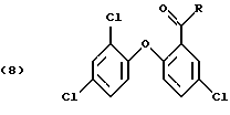 (57) Реферат: Изобретение относится к новому способу получения галоген-о-гидроксидифениловых соединений формулы (1), в которых Х- -О- или -СН2-, m = от 1 до 3, n = 1 или 2, которые применяются для защиты органических материалов от микроорганизмов, и к новым ацильным соединениям формулы (8), которые являются промежуточными продуктами, в которых R – незамещенный C1-С8алкил, замещенный 1-3 атомами галогена или гидрокси; или незамещенный С6-С12арил или С6-С12арил, замещенный 1-3 атомами галогена, С1-С5алкилом или C1-С8алкокси. Способ получения соединений формулы (1) включает четыре стадии. На первой стадии хлорируют соответствующее дифениловое соединение формулы (4), преимущественно газообразным хлором, желательно в присутствии пропил-сульфида и эквимолярного количества хлорида алюминия. На второй стадии полученное соответствующее хлорированное соединение формулы (5) ацилируют преимущественно хлористым ацетилом по реакции Фриделя-Крафтса в присутствии кислоты Льюиса, например хлористого алюминия, при эквимолярном соотношении хлористого ацетила и хлорида алюминия, обычно в присутствии галоидированного растворителя, с последующим возможным хлорированием полученного продукта после ацилирования. При этом возможно проведение ацилирования и возможного хлорирования в одном реакторе. На третьей стадии полученное ацильное соединение формулы (6), в котором значения заместителя R указаны выше, окисляют, как правило, смесью малеинового ангидрида, комплекса мочевина-перекись водорода и уксусной кислоты в качестве растворителя. На четвертой стадии гидролизуют полученное окисленное соединение формулы (7), в котором значения заместителя R указаны выше. Способ является экономичным и позволяет подавить нежелательные побочные реакции. 2 с. и 13 з.п. ф-лы, 8 табл. ![]() ![]()