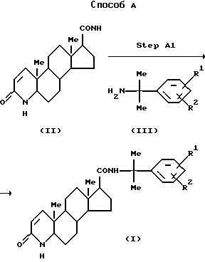 Новое применение по настоящему изобретению представляет собой применение соединения, представленного формулой (I), или его фармацевтически приемлемой соли или другого его производного, для получения композиции для лечения алопеции, гирсутизма по женскому типу или себореи, или для предупреждения метастаза в кости, вызванного раком предстательной железы, предпочтительно применение для получения указанной композиции N-[1-метил-1-(4-метоксифенил)этил]-3-оксо-4-аза-5 -андрост-1-ен-17 -карбоксамида:![]() где R1 и R2 являются одинаковыми или отличаются друг от друга, и каждый представляет атом водорода, гидроксильную группу или низшую алкоксигруппу. В формуле (I) термин “низшая алкоксигруппа” означает линейную или разветвленную C1-6-алкоксигруппу, такую как метокси, этокси, н-пропокси, изопропокси, н-бутокси, изобутокси, втор-бутокси, трет-бутокси, н-пентокси, изопентокси, 2-метилбутокси, неопентокси, н-гексилокси, 4-метилпентокси, 3-метилпентокси, 2-метилпентокси, 3,3-диметилбутокси, 2,2-диметилбутокси, 1,1-диметилбутокси, 1,2-диметилбутокси, 1,3-диметилбутокси или 2,3-диметилбутокси, из которых предпочтительна линейная или разветвленная C1-4-алкоксигруппа, и более предпочтительной является метоксигруппа. Термин “алопеция” означает облысение по мужскому типу и потерю волос на голове по женскому типу. Так как соединение (I) может образовывать соль, термин “фармацевтически приемлемые соли” обозначает соли соединения (I) настоящего изобретения, которое можно превратить в его соли, примерами таких солей являются предпочтительно соли щелочных металлов, такие как натриевая соль, калиевая соль и литиевая соль, соли щелочноземельных металлов, такие как кальциевая соль и магниевая соль, и соли металлов, такие как алюминиевая соль, соль железа и цинковая соль. Когда соединение (I) настоящего изобретения оставляют стоять на воздухе, оно может поглощать влагу или образовать гидрат. Такое вещество также охватывается настоящим изобретением. Соединение (I) настоящего изобретения можно получить по способу, представленному ниже: ![]() где R1 и R2 имеют указанные выше значения. В способе А соединение (I) получают посредством конденсации производного карбоновой кислоты с аминопроизводным. На стадии A1 соединение (I) получают с использованием соединения (II) или его реакционноспособного производного и соединения (III). Данную стадию осуществляют обычным методом, используемым в синтезе пептидов, например азидным методом, способом с активным сложным эфиром, способом со смешанным ангидридом или в процессе конденсации. Среди указанных способов азидный метод включает обработку азида амином (III). Азид получают посредством взаимодействия азотистой кислоты с гидразидом аминокислоты, который получают посредством взаимодействия соединения (II) или его эфира с гидразином при температуре приблизительно комнатной в инертном растворителе (например, диметилформамиде). Примерами соединений азотистой кислоты, используемых здесь, являются нитриты щелочных металлов, такие как нитрит натрия, и алкилнитриты, такие как изоамилнитрит. Взаимодействие осуществляют предпочтительно в инертном растворителе, и примерами растворителя, используемого здесь, являются амиды, такие как диметилформамид и диметилацетамид, сульфоксиды, такие как диметилсульфоксид, и пирролидоны, такие как N-метилпи