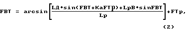При повороте УАП подают на ВУ электрический сигнал Uтр, пропорциональный требуемому значению Fтр угла поворота УАП Unp=Кт Fтр, (1)где Кт – коэффициент пропорциональности, и вычисляют требуемое значение Fвт угла поворота дополнительного вала 3, соответствующее значению Fтр. Значение Fвт определяют в результате решения методом последовательных приближений следующего трансцендентного уравнения ![]() где ![]() которое получено в результате анализа треугольников АВОд и ОрОдВ (фиг.1) с использованием теоремы синусов и с учетом того, что после окончания переходного процесса отклонения УАП 1 на угол Fт выполняется соотношение ![]() В ВУ формируют электрический сигнал Uвт, пропорциональный вычисленному значению Fвт (2) Uвт=Kв Fвт, (5)где Kв – коэффициент пропорциональности. С помощью соответствующих датчиков измеряют текущие значения угла поворота Fв дополнительного вала 3, угловой скорости и углового ускорения вращения УАП и формируют электрические сигналы Uв, Uуc и Uуу, пропорциональные соответственно измеренным значениям Fв, ![]() Uв=Кв Fв, (6)![]() ![]() где Кус, Куу – соответствующие коэффициенты пропорциональности. Эти сигналы подают на соответствующие входы ВУ, где вычисляют сумму Uc этих сигналов, которая с учетом (6)-(8) равна ![]() Затем в ВУ вычисляют разность dU сигналов Uвт и Uc, которая с учетом выражений (5) и (9) равна ![]() где dFв=Fвт-Fв. (11) Полученный сигнал dU усиливают и подают на РМ. В результате выходной вал РМ начинает перемещаться, поворачивая вал 3 с вилкой 4 и изменяя значение угла Fв в сторону уменьшения разности dFв. При этом через выступ 5, находящийся в прорези вилки 4, поворачивается рычаг 6 и скрепленная с ним ДУАП 2. В результате изменяется значение Fд угла поворота ДУАП 2, являющегося углом атаки ДУАП 2 в воздушном потоке. Поэтому изменяется значение создаваемой ДУАП 2 аэродинамической управляющей силы Yд ![]() где q – скоростной напор. Момент силы Yд относительно оси Од вращения ДУАП 2 уравновешивается моментом сил реакции выступа 6 в вилке 4. Поэтому сила Yд относительно оси Ор вращения УАП 1 приложена в точке Од и при изменении ее значения изменяется значение создаваемого ею момента Mд относительно этой оси Мд=Yд Lp. (13)Под действием этого момента изменяется значение Fт угла поворота УАП 1, являющегося углом атаки УАП 1 в воздушном потоке. В результате этого изменяется значение создаваемой УАП 1 аэродинамической управляющей силы Yр ![]() Так как знак угла атаки Fт противоположен знаку угла атаки Fд, то сила Yp направлена противоположно направлению силы Yд и момент Мшр Мшр=Yp Lрш (15)силы Yд относительно оси Ор вращения УАП 1 направлен противоположно направлению момента Мд. Поэтому поворот УДП 1 закончится тогда, когда после окончания переходного процесса наступит равенство моментов Мшр и Mд Мшр=Мд. (16) При достижении равенства Fв=Fвт, (17) после окончания переходного процесса поворота УАП 1 значения и становятся равными нулю и сигнал dU (10) также становится равным нулю, вследствие чего прекращается перемещение выходного вала РМ и изменение значений углов Fв, Fд и Fт. При этом вал 3 повернется на требуемый угол Fвт (2). Так как значение Fвт (2) определено при условии поворота УАП 1 на угол Fтр, то значение угла Fт, обеспечивающее выполнение равенства (17), из которого следует выражение (3) для Ка, равно требуемому значению Fтр угла поворота УАП 1.