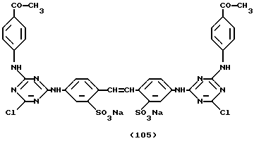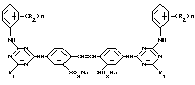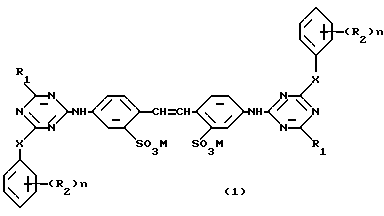 Соединения формулы (1) могут быть продуцированы в известных реакционных условиях посредством реакции хлорида циануровой кислоты, осуществляемой в любой нужной последовательности с каждым соединением 4,4′-диамино-2,2′-стильбендисульфоновой кислоты, аминосоединением, способным вводить группу: (R2)n, NH, где R2 и n имеют значения, указанные выше; и соединением, способным вводить группу R1, где R1 имеет значение, указанное выше.