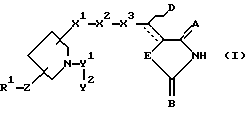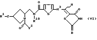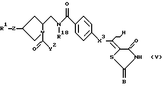 (57) Реферат: Изобретение относится к производным пирролидина формулы I ![]() где R1– Н, С1-С6алкил; фенил, возможно замещенный; бифенил, возможно замещенный; 1Н, 5Н – пиридо [3,2,1-ij] хинолил; фенил С1-С6алкил, необязательно замещенный; бифенил С1-С6алкил, необязательно замещенный; бифенилкарбонил; терфенил; нафтил, необязательно замещенный; Z означает -S-, -О-, -ОСН2-, -N(R16), где R16– Н, С1-С6алкил, С3-С8циклоалкилС1-С6алкил, фенилС1-С6алкил, химическая связь; Х1 означает -СО-, -(СН2)r-СО-N(R17), где R17 означает Н, С1-С6 алкил (где r = 0 или 1), -СН2NHSO2-, -(СН2)s-N (R18)-СО- (где R18– Н, s=1-3), – СН2NHCОСН2О-, -СН2N (R19)СОСН = СН- (где R19– Н), -СН2ОСН2-, -СН2-N (R20)-СН2– (где R20– Н, С1-С6алкил, С1-С6алкилкарбонил, фенилкарбонил), С1-С5алкилен, С2-С4алкенилен, химическая связь; Х2 – фенилен, необязательно замещенный гидрокси, тиофендиил, фурандиил, пиперидиндиил, , химическая связь; Х3 – С1-С5алкилен, С2-С4алкенилен, химическая связь; А – кислород; В и E – каждый независимо означает -О- или -S-; D-Н; V1-СО-; Y2 заместитель формулы:![]() ![]() ![]() R2 и R3 каждый – Н; R4– фенил, возможно замещенный галогеном; R5 – фенил, возможно замещенный; цикл G – фенил, С3-С7циклоалкил, пиридил, тиенил; цикл J – фенил; L – фенил; р=0-2; —– означает наличие или отсутствие химической связи; отображает цис- или транс-конфигурацию D относительно Е; при условии, что Х1 означает -СН2NHCО-, Х2 означает 1,4-фенилен и Х3 означает химическую связь или С1-С5алкилен, когда атом углерода, связанный СD и смежный с ним атом углерода в цикле связаны простой связью и V1 не означает химическую связь, когда Х1 означает -СН2О-; фармацевтически приемлемая соль или гидрат соединения. Соединения I ингибируют фосфолипазу А2 и могут быть использованы в фармацевтической композиции в качестве активного агента. 2 с. и 14 з.п. ф-лы, 38 табл.