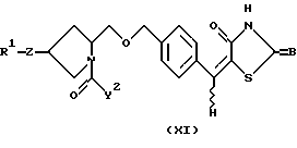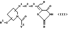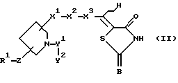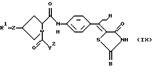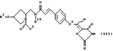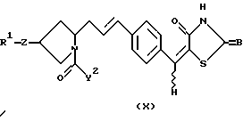 ![]() где R1 означает атом водорода, прямой или разветвленный С1-С6алкил, фенил, необязательно замещенный одним или несколькими заместителями, выбранными из группы, содержащей фенилС2-С4алкенил, С1-С6алкил, С3-С7циклоалкил, галоген, С1-С6алкокси, нафтил, бензо-1,3-диоксоланил, 2-пиридил, фенилС1-С6алкил, фенилокси, моно- или дизамещенный амино и N-метилпиразинил, бифенил, необязательно замещенный одним или несколькими заместителями, выбранными из группы, содержащей С1-С6алкил, С1-С6алкокси, тригалоС1-С6алкил и гидрокси, терфенил, нафтил, необязательно замещенный одним или несколькими заместителями, выбранными из группы, содержащей фенил и галоген, фенил, конденсированный с С3-С7циклоалкилом, 2,3,6,7-тетрагидро-1Н,5Н-пиридо[3,2,1-ij] хинолил, фенилС1-C6алкил, необязательно замещенный одним или несколькими заместителями, выбранными из группы, содержащей С1-С6алкил, галоген, фенил, нафтил, тиенил, бензофуранил, фенилС1-С6алкил, фенилокси, моно- или дизамещенный амино и фенил, замещенный одним или несколькими заместителями, выбранными из группы, содержащей С1-С6алкил и галоген, бифенилС1-С6алкил, необязательно замещенный одним или несколькими заместителями, выбранными из группы, содержащей С1-С6алкил, С1-С6алкокси, галоген, тригалоС1-С6алкил, нитро и амино, нафтилС1-С6алкил, необязательно замещенный фенилом, и бифенилкарбонил; Z означает -S-, -О-, -ОСН2-, -N(R16)- (где R16 означает атом водорода, С1-С6алкил, С3-С8циклоалкилС1-С6алкил или фенилС1-С6алкил), или химическую связь; X1 означает -СО-, -(CH2)r-CO-N(R17)- (где R17 означает атом водорода или C1-С6алкил, а r означает целое число от 0 до 1), -CH2NHSO2-, -(CH2)s-N(R18)-CO- (где R18 означает атом водорода, a s означает целое число от 1 до 3), -CH2NHCOCH2O-, -CH2N(R19)COCH=CH- (где R19 означает атом водорода), -СН2ОСН2-, -CH2-N(R20)-CH2– (где R20 означает атом водорода, С1-С6алкил, C1-С6алкилкарбонил или фенилкарбонил), С1-С5алкилен, С2-С4алкенилен или химическую связь; Х2 означает фенилен, необязательно замещенный гидрокси, тиофендиил, фурандиил, пиперидиндиил, или химическую связь;X3 означает С1-С5алкилен, С2-C4алкенилен или химическую связь; А означает атом кислорода; В и Е каждый независимо друг от друга означает атом кислорода или атом серы; D означает атом водорода; Y1 означает -СО-; Y2 означает заместитель формулы ![]() ![]() ![]() где R2 и R3 каждый означает атом водорода; R4 означает фенил, который может быть замещен галогеном; R5 означает фенил, необязательно замещенный одним или несколькими заместителями, выбранными из группы, содержащей 1-С6алкил, галоген, амино и моно- или дизамещенный амино, С3-C7циклоалкил, тиенил и фурил; цикл G означает фенил, С3-С7циклоалкил, пиридил или тиенил; цикл J означает фенил; цикл L означает фенил; р означает целое число от 0 до 2; пунктирная линия (—-) означает наличие или отсутствие химической связи; волнистая линия (~ ) отображает цис- или транс-конфигурацию D относительно Е; при условии, что Х1 означает -CH2NHCO-, Х2 означает 1,4-фенилен и Х3 означает химическую связь или С1-С5алкилен, когда атом углерода, связанный с D, и смежный с ним атом углерода в цикле связаны простой связью, и Y1 не означает химическую связь, когда Х1 означает -СН2О-; фармацевтически приемлемая соль или гидрат указанного соединения. 2. Соединение по п.1, представленное формулой (II) ![]() где R1, Z, X1, X2, X3, Y1, Y2 и В имеют значения, указанные выше, волнистая линия означает цис- и транс-конфигурацию атома водорода относительно атома серы, 