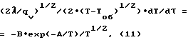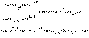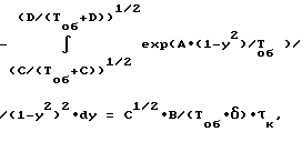 Температуру Т на открытой торцевой поверхности топливной таблетки (принимаем ее как пластину с источниками тепла, охлаждаемую с одной стороны) в соответствии с [18] и, учитывая плотный контакт таблетки с торцем стакана, для каждого момента времени можно определить из выраженияT( ) = qv x2/(2 )+Tоб. (9)Из (9) найдем x( ) и продифференцируем его по ![]() ![]() Приравняв правые части выражений (8) и (10) и подставив выражение для из (4), с учетом выражений (5), (6) и (7), получим дифференциальное уравнение вида![]() где коэффициент В зависит от вида ТМ и определяется выражением B = B*/ тм (M/(2![]() R0))1/2. (12)Преобразуем (11) к виду ![]() где C = qv ![]() 2/(2 ), град. (14)Преобразуем уравнение (13), введя замену переменной у=(1-Тоб/Т)1/2. (15) Откуда из (15) получаем dT=2у Тоб/(1-y2)2 dy; (16)ехр(А/Т)=ехр(А (1-у2)/Тоб). (17)Подставляя (16) и (17) в (13), получим дифференциальное уравнение с разделенными переменными -ехр(А (1-y2)/Toб)/(1-у2)2dy=С1/2 В/(Tоб![]() ) d . (18)Интегрируем левую часть дифференциального уравнения (18) по у от у( =0) до y( = к), а правую по от =0 до = к.Нижний предел у(0) интеграла в соответствии с (9) и (14), имея в виду, что х(0)= , будет определяться выражениему(0)=(С/(Тоб+С))1/2. (19) Верхний предел y( к) определяется из следующих соображений. В процессе переконденсации ТМ внутри твэла образуется центральная газовая полость с изотермической поверхностью по завершению процесса переконденсации, т.е. при = к [19] . Причем в первом приближении, можно считать, при достаточной изотермичности оболочки твэла, толщину конденсата ТМ по внутренней поверхности оболочки твэла постоянной [20]. Отсюда, зная площадь внутренней поверхности оболочки твэла S и объем топливной таблетки V, можно определить x( к) из соотношенияx( к) = V/S = V/(2![]() Rc (Rc+Lc)). (20)Из (9) и (15), используя (20), определяем T( к) и y( к)T( к) = Tоб+qv x2/(2 );y( к) = (D/(Tоб+D))1/2, (21)где D = qv V2/(2![]() (2![]() Rc (Rc+Lc))2). (22)Интегрируя левую часть дифференциального уравнения (18) по у от y( = 0) до y( = к), а правую по от = 0 до = к, с учетом (19) и (21), получаем выражение (2)![]() Выражение (3) получено следующим образом. Для обеспечения зазора между цилиндрической оболочкой твэла и боковой стенкой стакана после помещения твэла в реактор и нагрева его на T градусов должно соблюдаться условиеRc (1+ об![]() T)-d (1+ тм![]() T)/2- ст>0, (23)где Rс – внутренний радиус твэла, м; T – нагрев тела, град; тм, об – коэффициенты линейного расширения ТМ и торцевой оболочки твэла соответственно, град-1;d – диаметр топливной таблетки, м; ст – толщина боковой стенки тонкостенного стакана, м.