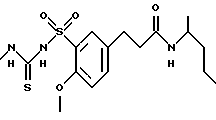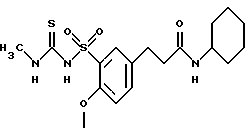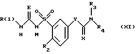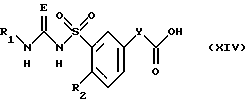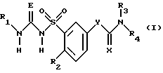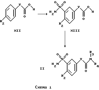 ![]() где R1 обозначает водород, С1-7-алкил, С3-7-циклоалкил; R2 обозначает водород, C1-6-алкоксил; R3, R4 каждый независимо друг от друга обозначает водород, С1-12-алкил, С3-10-циклоалкил; Е обозначает кислород или серу; Х обозначает кислород; Y обозначает (CR5R5′)m, где R5, R5′ обозначают водород; m=1, 2, 3, а также их фармацевтически приемлемые соли. 2. Соединение формулы (I) по п.1, отличающееся тем, что R обозначает водород, C1-4-алкил, С3-7-циклоалкил; R2 обозначает С1-4алкоксил; R3 и R4 каждый независимо друг от друга обозначает водород С1-10 алкил, С3-6 циклоалкил; Е обозначает кислород или серу; Х обозначает кислород; Y обозначает (CR5R5′)m, где R5, R5′ обозначают водород; m=1, 2, 3. 3. Соединение формулы (I) по п.1 или 2, отличающееся тем, что R1 обозначает водород, C1-4-алкил, циклоалкил с 3 или 4 С-атомами; R2 обозначает метокси- или этоксигруппу; R3 и R4 каждый независимо друг от друга обозначает водород, С4-8-алкил, С3-6-циклоалкил; Е обозначает серу или кислород; Х обозначает кислород; Y обозначает (CR5R5′)m, где R5 и R5′ обозначают водород; m = 1 или 2. 4. Соединение формулы (I) по любому из пп.1-3, отличающееся тем, что R1 обозначает водород, С1-3-алкил, или циклоалкил с 3 С-атомами; R2 обозначает метокси- или этоксигруппу; R3 и R4 каждый независимо друг от друга обозначает водород, С5-8-алкил, С5-6-циклоалкил; Е обозначает кислород или серу; Х обозначает кислород; Y обозначает (CR5R5′)m, где R5 и R5′ обозначают водород; m = 1 или 2. 5. Соединение формулы (I) по любому из пп.1-4, отличающееся тем, что R1 обозначает водород, C1-3-алкил или циклоалкил с 3 С-атомами. R2 обозначает метокси- или этоксигруппу; R3 обозначает водород; R4 обозначает C5-8 алкил или С5-6 циклоалкил; E обозначает серу или кислород; Х обозначает кислород; Y обозначает (CR5R5′)m, где R5 и R5′ обозначают водород; m = 1 или 2. 6. Способ получения бензолсульфонилтиомочевины, отличающийся тем, что бензолсульфонилтиомочевину формулы (Ib) ![]() получают путем взаимодействия бензолсульфонамида формулы (II) ![]() или его соли формулы (111) ![]() где R2, R3, R4, X и Y имеют указанные в п.1 значения, М обозначает катион щелочного или щелочно-земельного металла, с R1-замещенным тиозоцианатом формулы (VI) R1-N=C=S, (VI) где R1 имеет указанные в п.1 значения. 7. Соединения формулы (I) по п.1, обладающие антиаритмической активностью. 8. Способ получения фармацевтической композиции, обладающей антиаритмической активностью, отличающийся тем, что эффективное количество соединения формулы (I) по пп.1-6 или его физиологически приемлемой соли вместе по меньшей мере с одним носителем или вспомогательным веществом доводят до пригодной дозировочной формы. 9. Фармацевтическая композиция, обладающая антиаритмической активностью, включающая активное вещество и фармацевтически приемлемые добавки, отличающаяся тем, что в качестве активного вещества она содержит соединение формулы (I) по пп.1-5 или его физиологически приемлемую соль в эффективном количестве. Приоритет по пунктам: 17.02.1995 – по пп. 1-4 и 6-9; 23.06.1995 – по п.5. РИСУНКИ